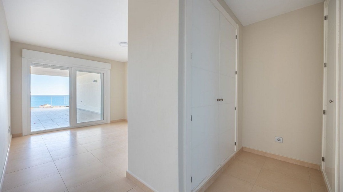 Upon entering the residence, you are greeted by an entrance hall that welcomes you into a beautiful dining and living room with direct access to the terrace, allowing you to enjoy the sea views at any time of the day. The kitchen, which is fully furnished and equipped, comes with a gallery that adds convenience and functionality to your daily life.
