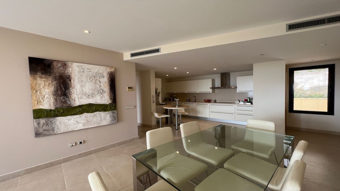 The apartment features a spacious open-plan living and dining area that flows effortlessly onto a private terrace, where you can savour the beauty of the surrounding scenery. The modern kitchen is fully equipped with high-end appliances, perfect for culinary enthusiasts.