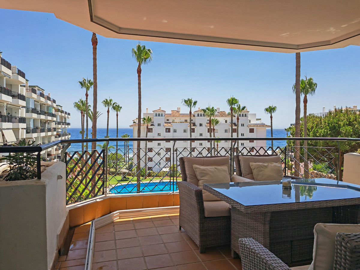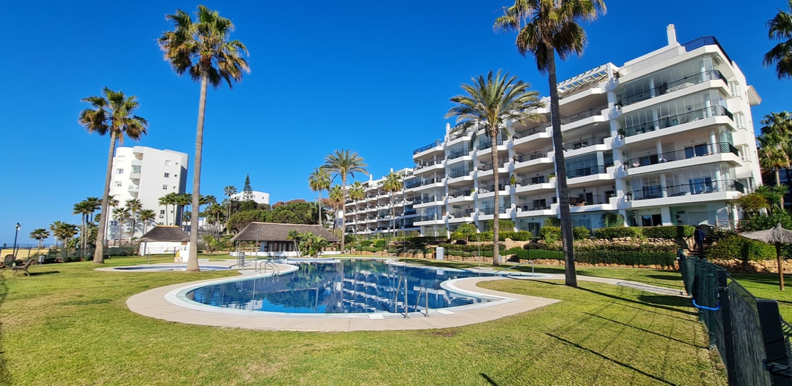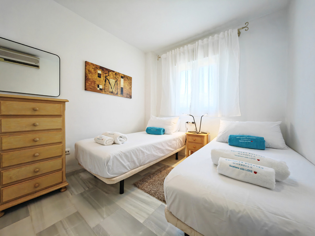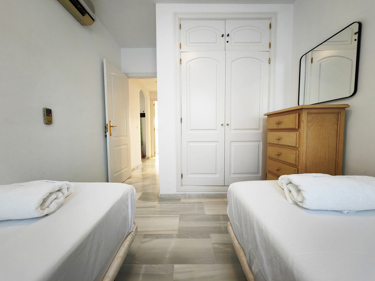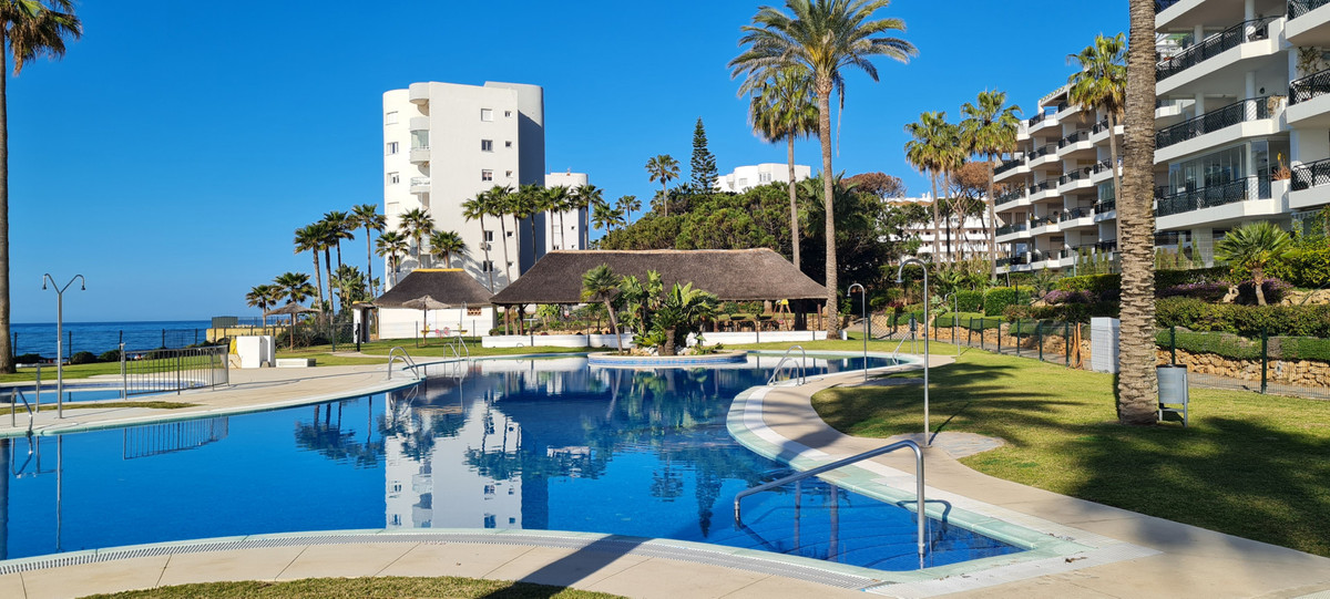 Apartment for sale in , Mijas Costa with 2 bedrooms, 2 bathrooms, 1 on suite bathroom and with orientation south, with communal swimming pool, private garage and communal garden. Regarding property dimensions, it has 81.5 m² built and 24.2 m² terrace. Has the following facilities amenities near, transport near, air conditioning, fully furnished, fully fitted kitchen, utility room, marble floors, storage room, security service 24h, private terrace, water tank, sea view, internet – wi-fi, covered terrace, 24h service, fitted wardrobes, gated community, lift, garden view, pool view, tennis / paddle court, beachside, doorman, close to children playground, close to sea / beach, close to golf, balcony, optional furniture, handicap accessible, excellent condition, close to shops, close to town, close to port, close to schools and surveillance cameras.
