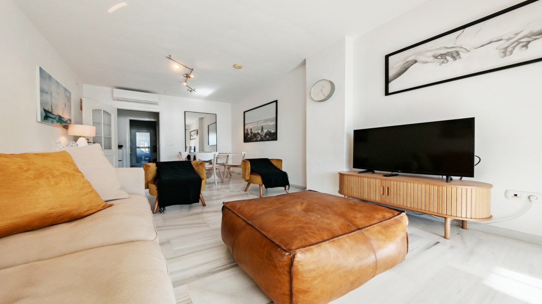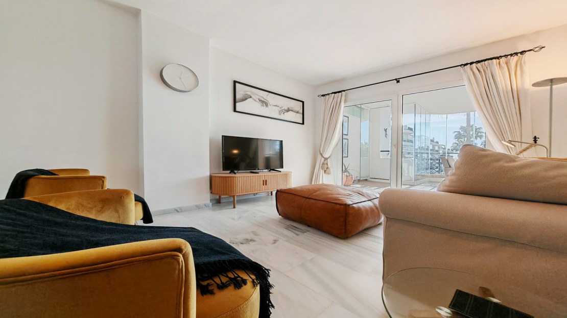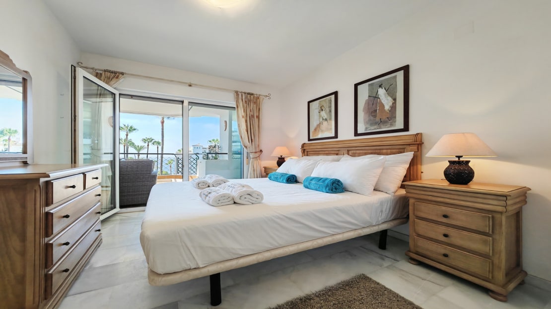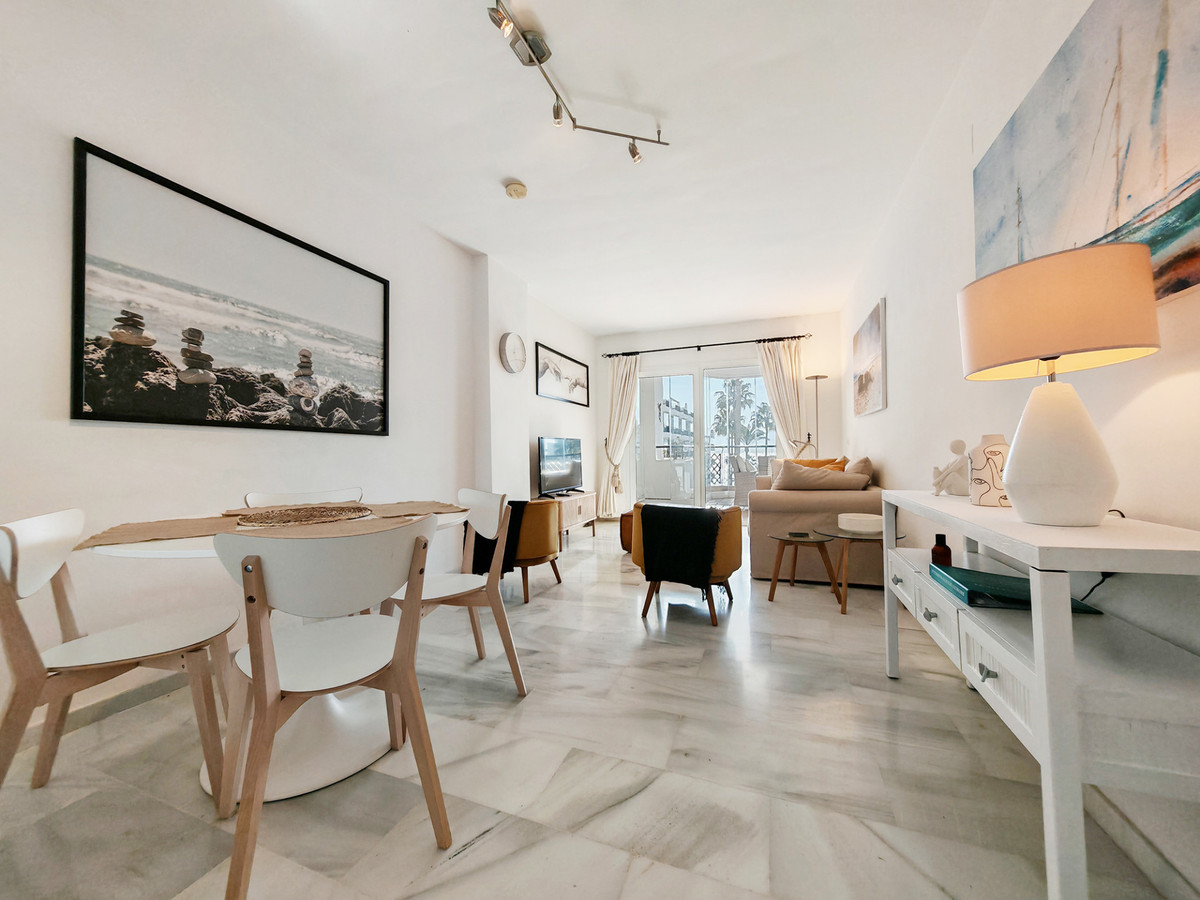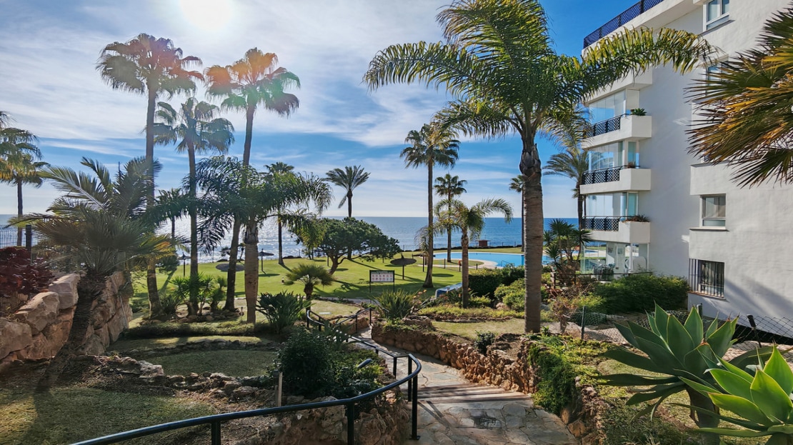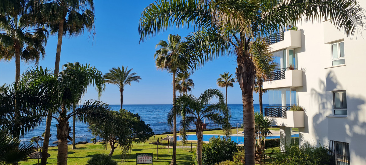 Apartment for sale in , Mijas Costa with 2 bedrooms, 2 bathrooms, 1 on suite bathroom and with orientation south, with communal swimming pool, private garage and communal garden. Regarding property dimensions, it has 81.5 m² built and 24.2 m² terrace. Has the following facilities amenities near, transport near, air conditioning, fully furnished, fully fitted kitchen, utility room, marble floors, storage room, security service 24h, private terrace, water tank, sea view, internet – wi-fi, covered terrace, 24h service, fitted wardrobes, gated community, lift, garden view, pool view, tennis / paddle court, beachside, doorman, close to children playground, close to sea / beach, close to golf, balcony, optional furniture, handicap accessible, excellent condition, close to shops, close to town, close to port, close to schools and surveillance cameras.