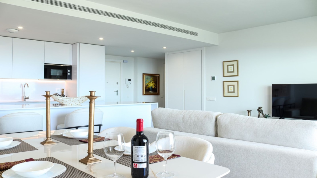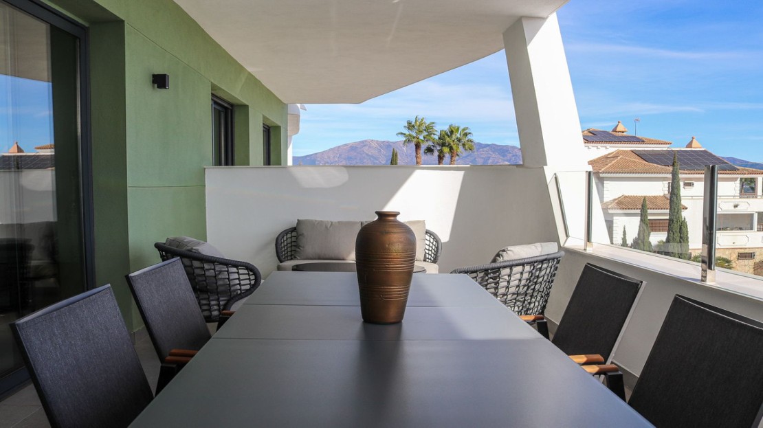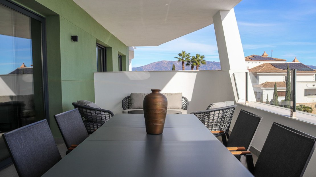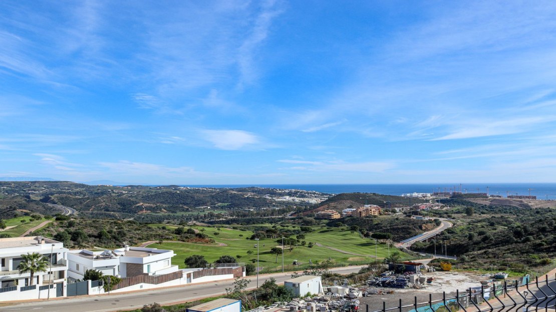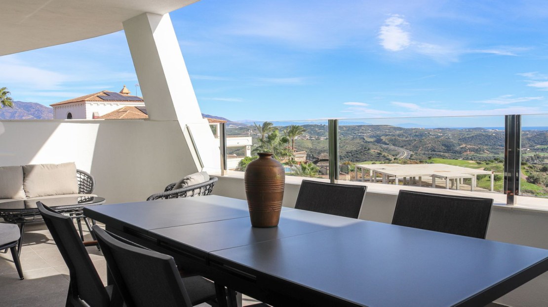 A standout feature of this property is the expansive private terrace, accessible from the living area, offering breathtaking direct south-facing views of the sparkling Mediterranean Sea and the lush fairways of the Calanova Golf Course. This is the perfect setting for relaxing or dining alfresco while soaking in the beauty of the Costa del Sol.