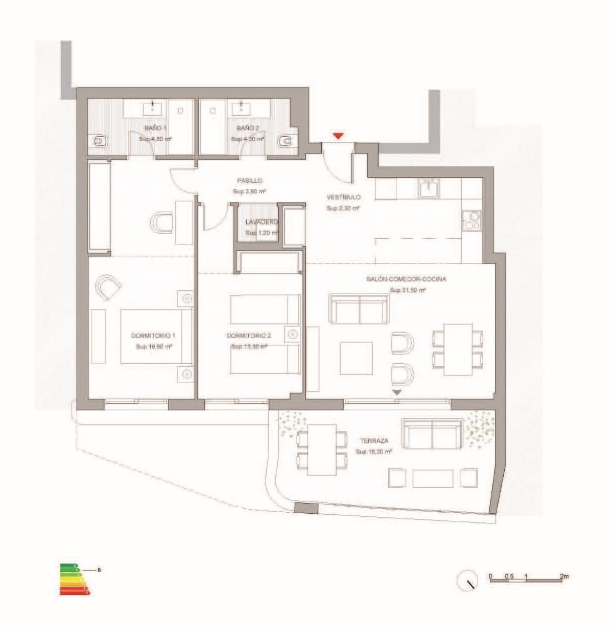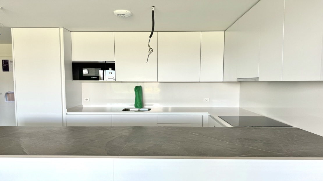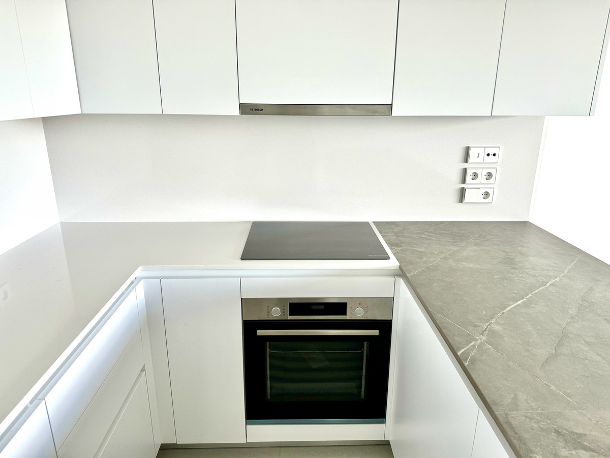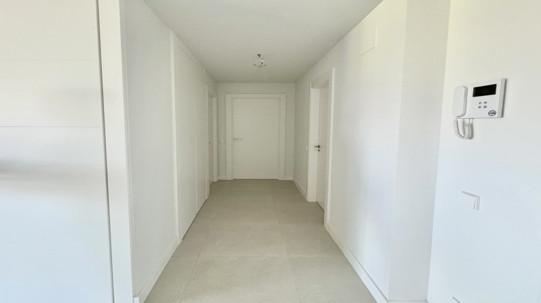 Comprises of two bedrooms with fitted wardrobes , two bathrooms with underfloor heating ,fitted wardrobes in the hallway, lounge diner with an open plan kitchen with Bosch appliances ,and a covered terrace .