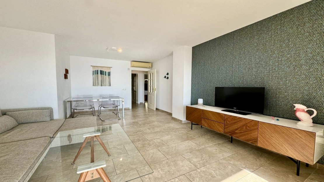 A bright and spacious living room with both a dining and lounge area, leading to a lovely south-facing covered terrace with a breathtaking view of the Mediterranean, the beautiful beaches, and the coast.