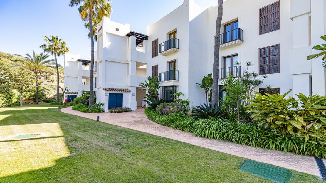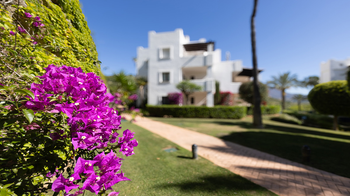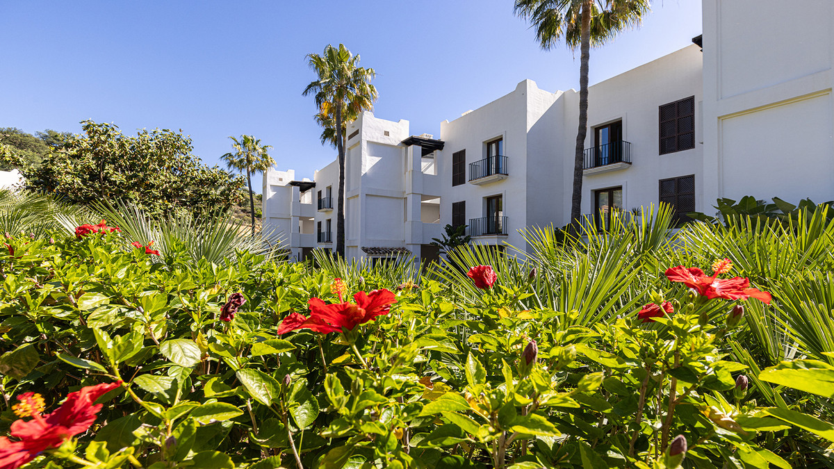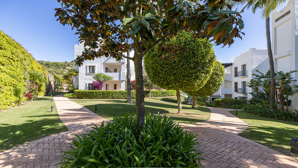The apartment is part of a secure gated complex on the western side of The Finca Cortesin Hotel & Golf complex. This is an exclusive Andalucian-style development painted a brilliant white, giving the urbanisation a clean and elegant feel. The architects have worked hard to keep it in with the Andalucian theme and have presented a beautiful complex which fits in with its surrounding. There are lush gardens, beautiful flowers, mature palm trees and a feeling that you are in an oasis. The urbanisation has fabulous communal gardens and communal pools.