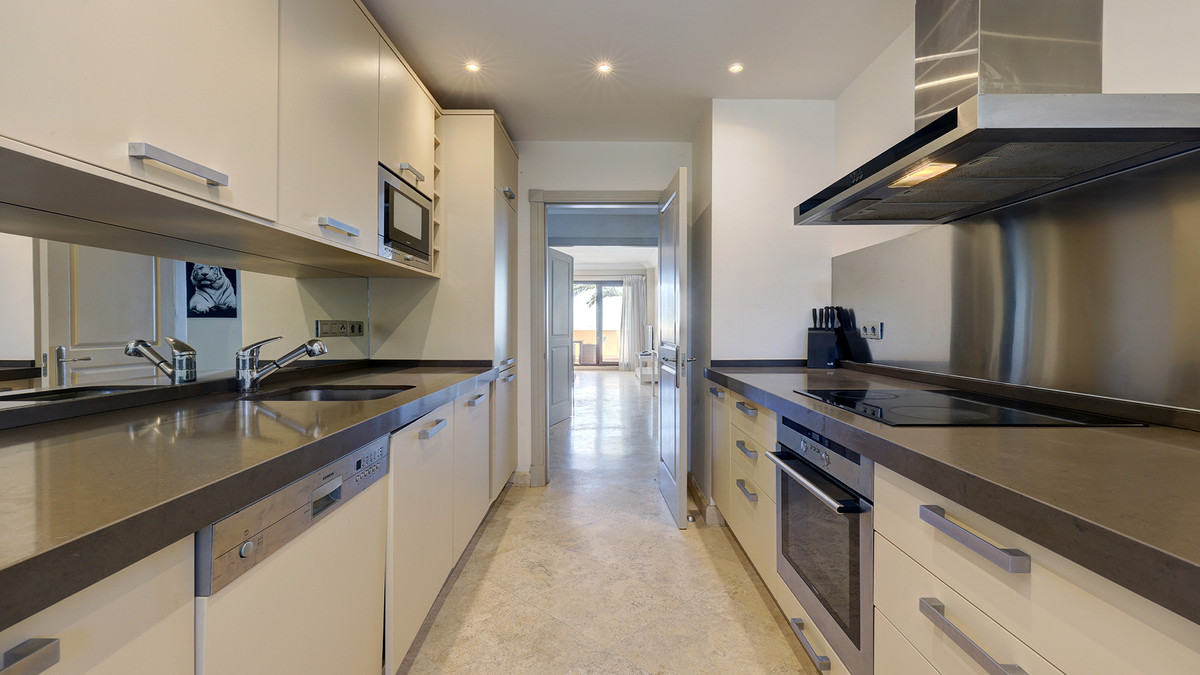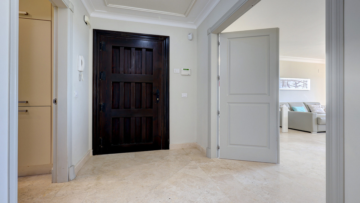 The entrance is through a brightly covered atrium and through a magnificent fortified oak panel doorway. The Italian marble entrance hallway leads through to the large dining-living room area & on through to a magnificent covered dining & sitting terrace area. From the hallway, opposite is a separate fitted and equipped, modern kitchen & utility area with Siemens appliances. The apartment has excellent quality specifications. Daikin's top quality air conditioning is throughout, with individual controls in all rooms.