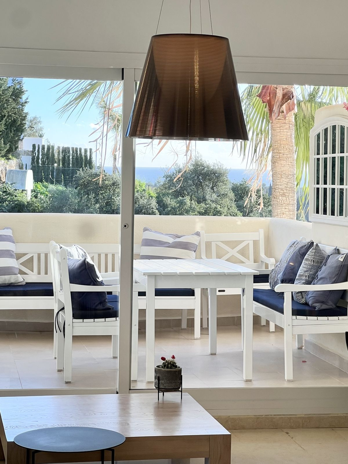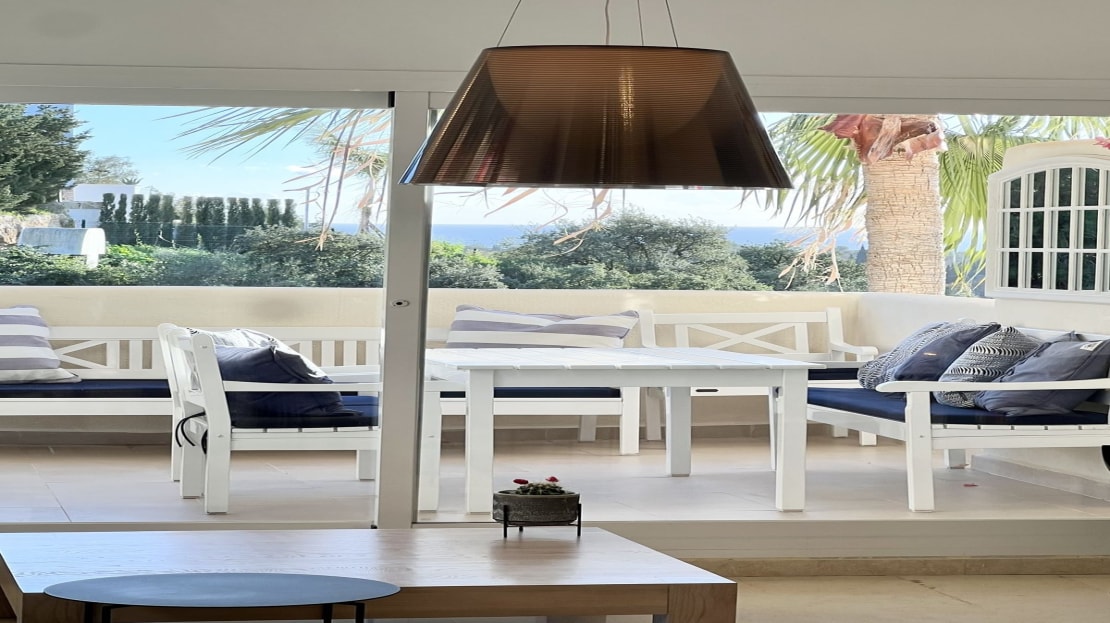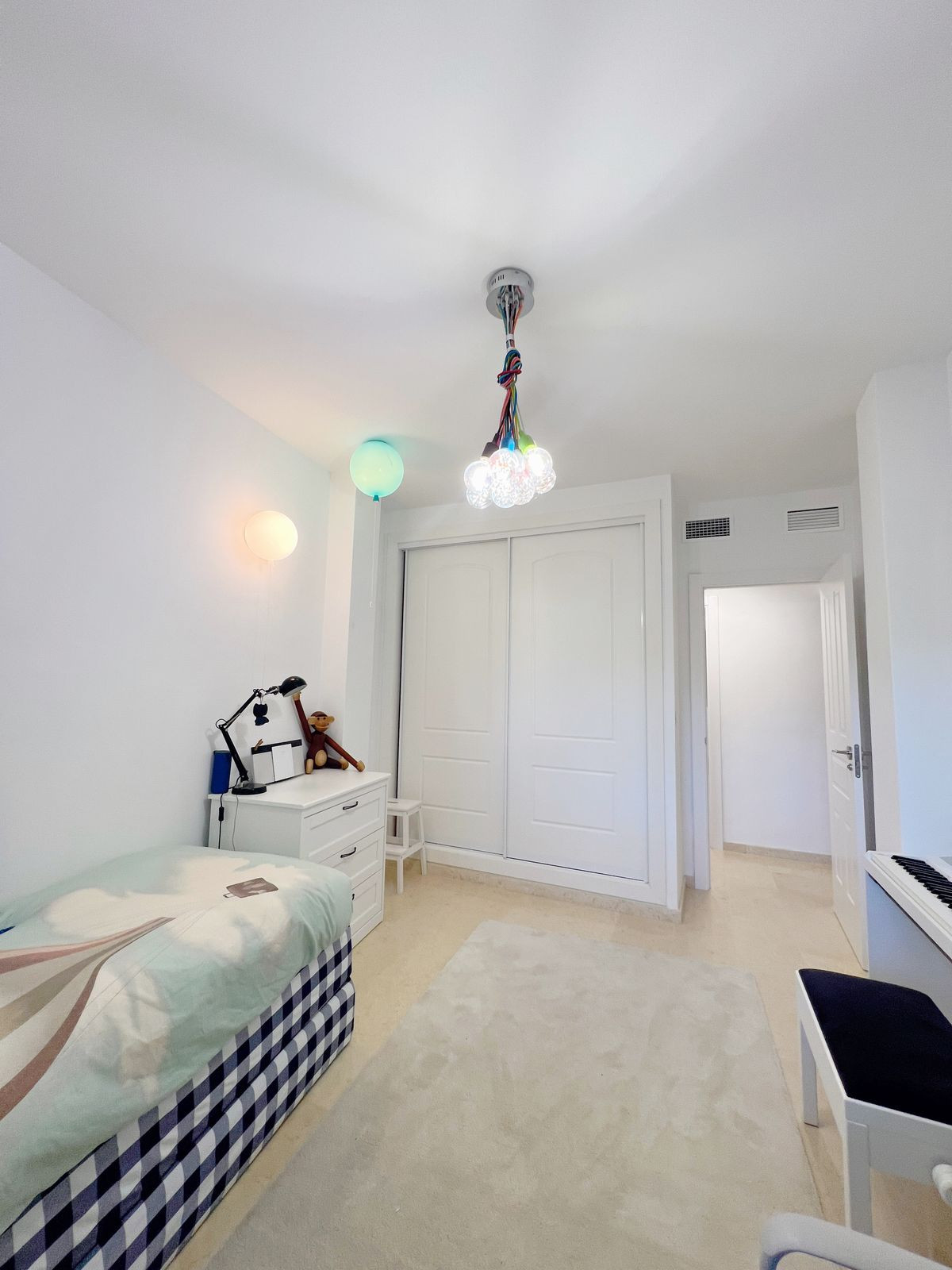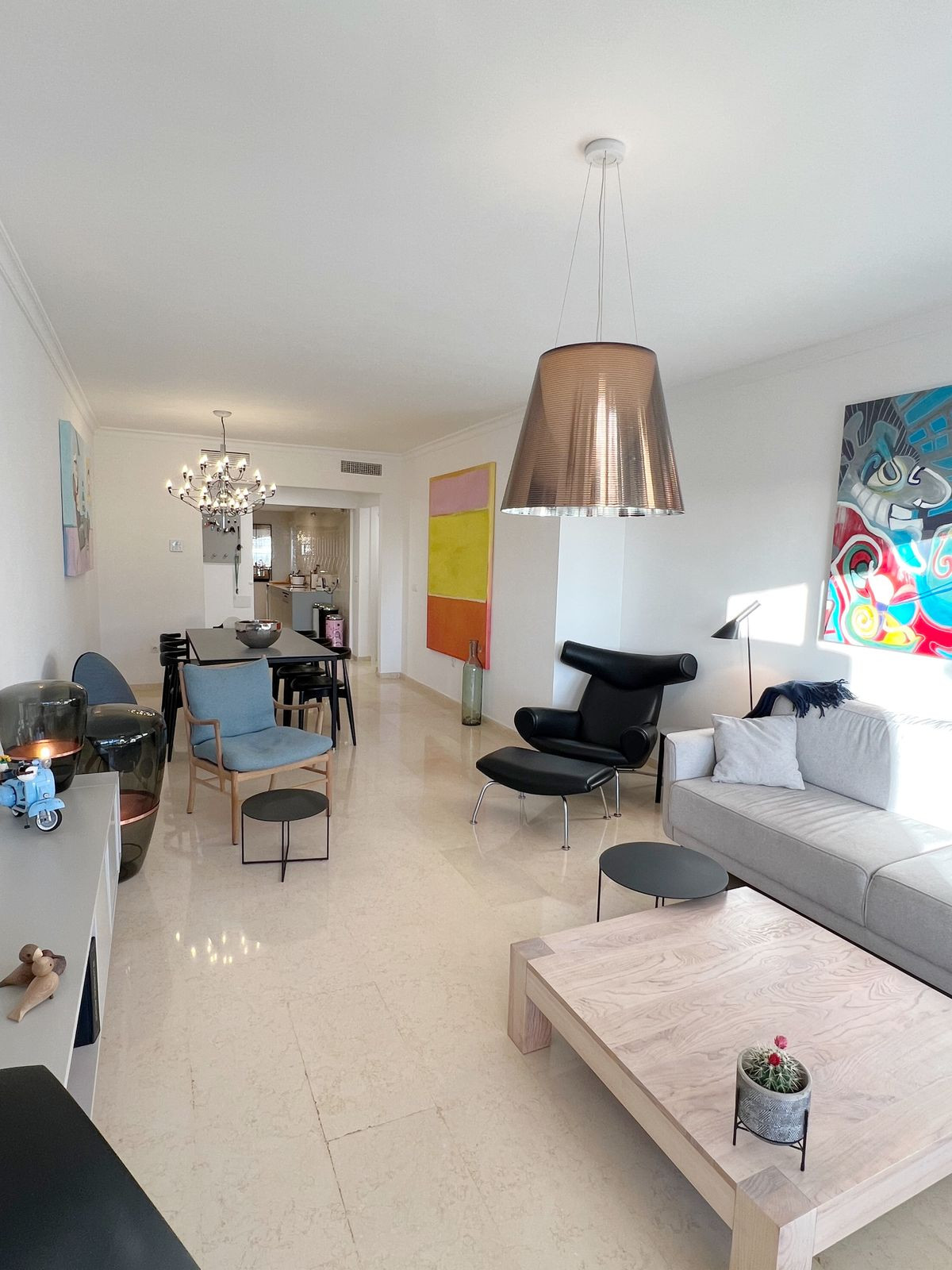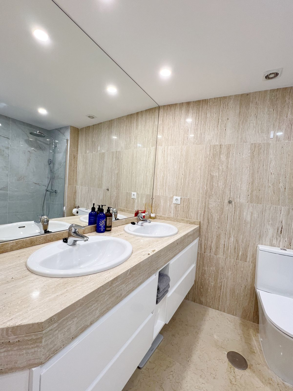 The master bedroom has brand new designer glass wardrobes (2x2m) with LED plus in the coridor 3,5m covered wardrobes. En-suite bathroom with a NEW walk-in spacious shower and heated mirror. The spacious bright living room opens onto a large terrace with beautiful sea views, extremely quiet and very private. The entire apartment is equipped with brand new air conditioning for both cooling and heating. The terrace has brand new tiles in light bright beige color.