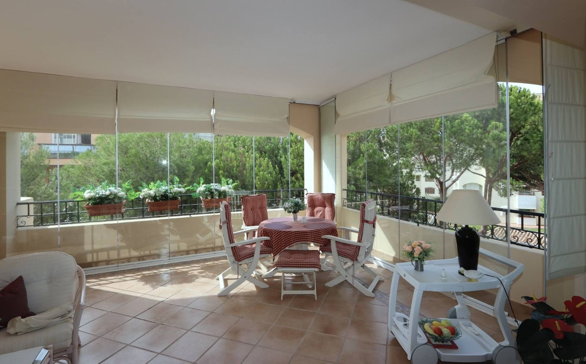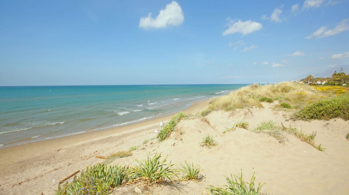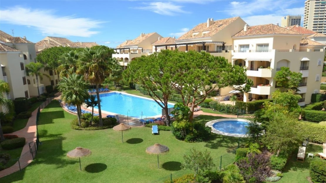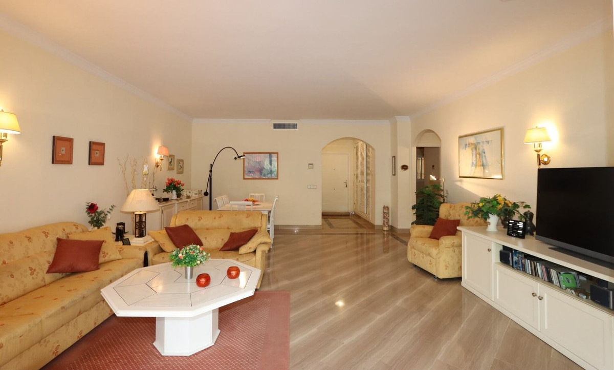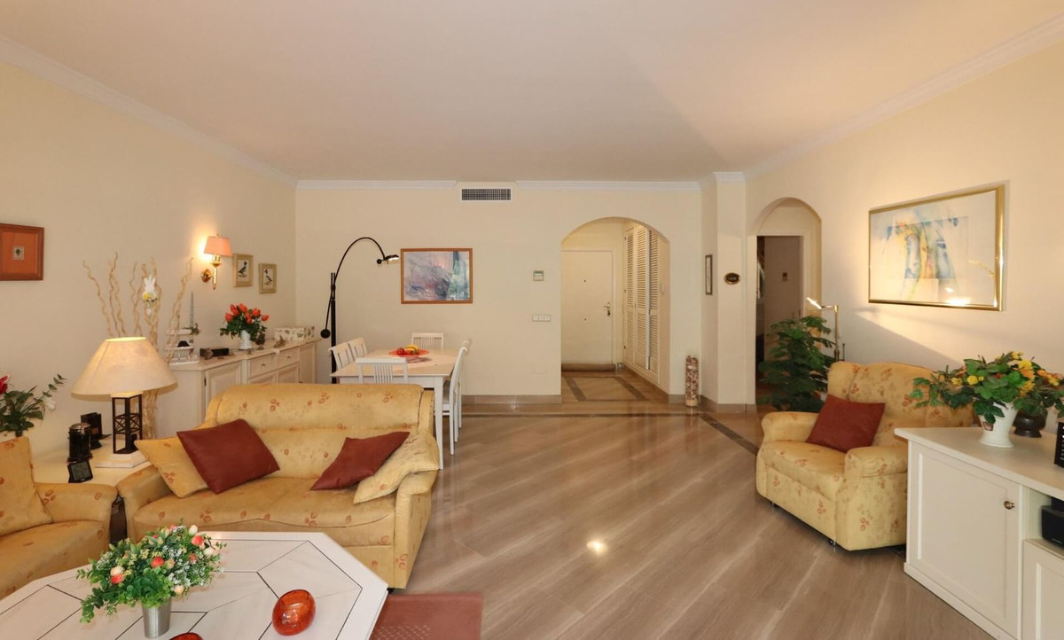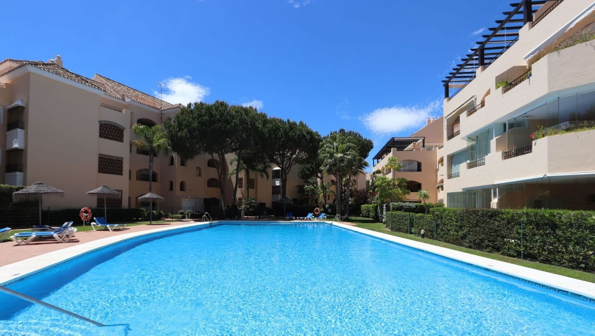 Excellent opportunity! Luxury apartment in one of the most sought after residential complexes in Elviria Hacienda Playa. The property is located walking distance to the beach (50 meters) and just a few steps from all services such as restaurants, banks, churches, schools, etc. This south facing apartment with a living area of ​​110 m2 + 42 m2 terrace consists of 2 bedrooms, 2 bathrooms, fully furnished and equipped kitchen, a large living room and a very sunny terrace. Air conditioning, hot / cold, Well maintained complex with communal gardens and pool. All this surrounded by beautiful tropical gardens. The apartment is in excellent condition and is very well maintained. An ideal option to enjoy life in Marbella right by the sea. The apartment includes an underground parking space and a basement room. 2 bedrooms, 2 bathrooms, living area 110 m2 + 42 m2 terrace, south facing. Built in 2002. This is the perfect home for a permanent holiday stay. Its position and features make it very attractive on the rental market.