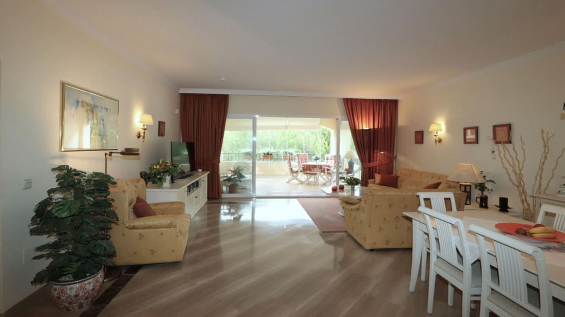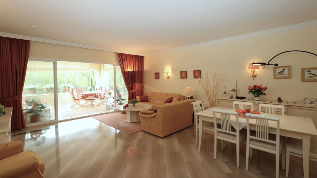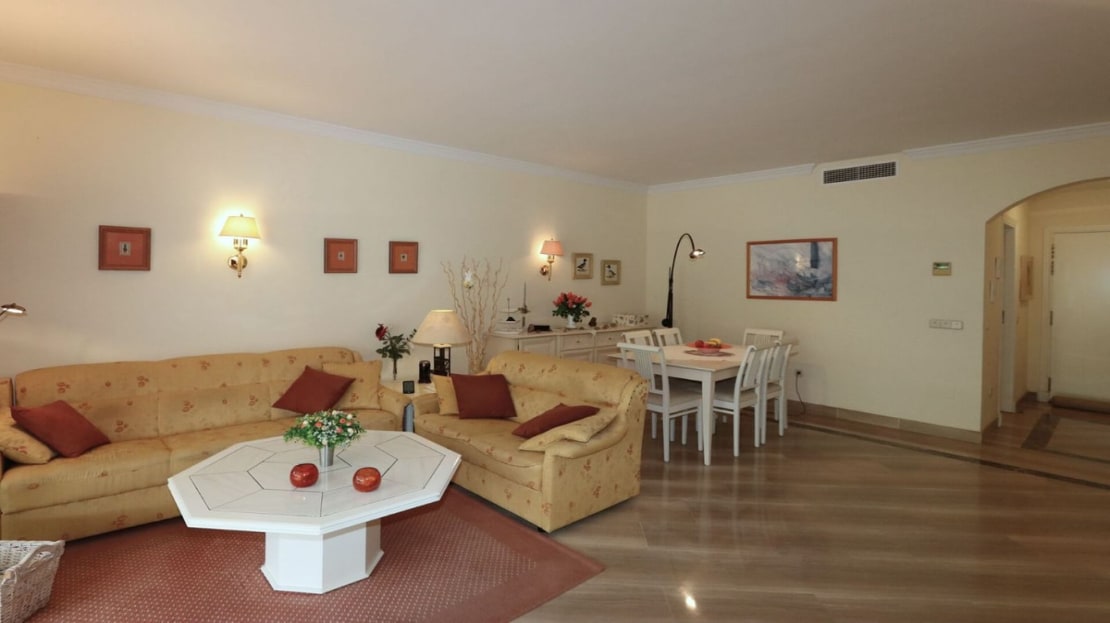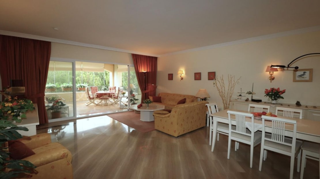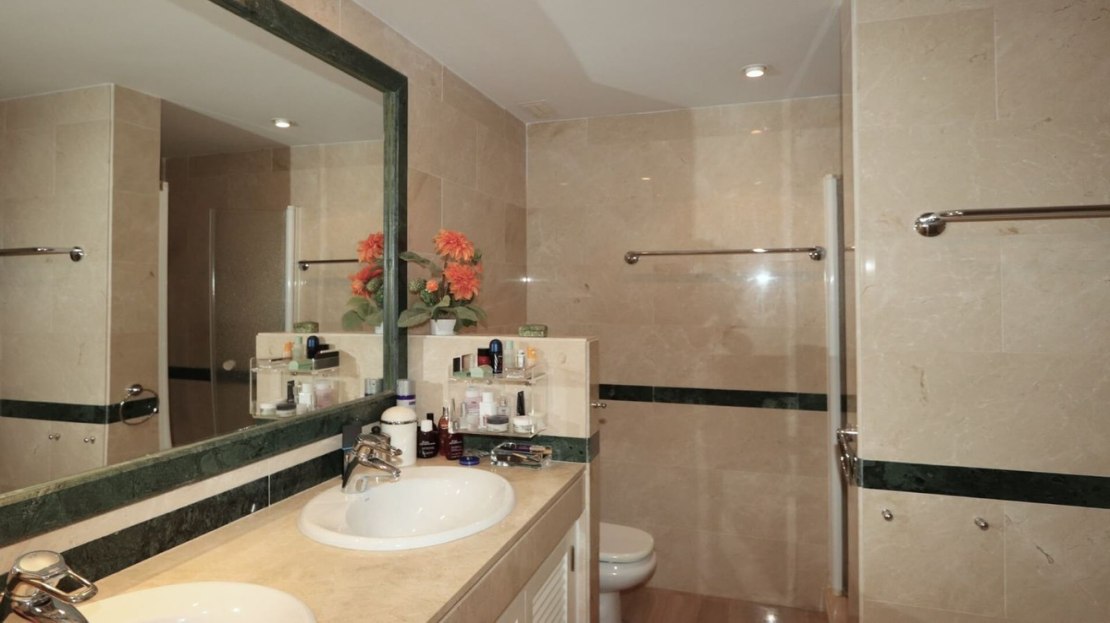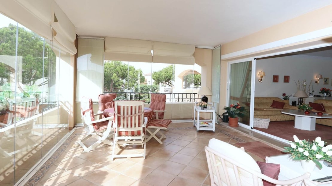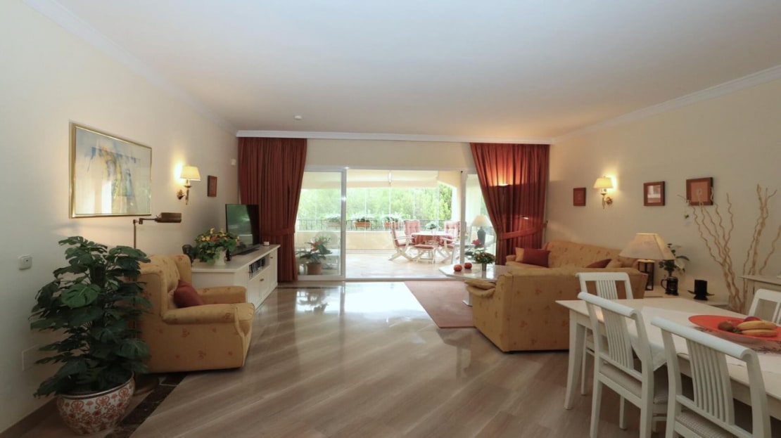 Excellent opportunity! Luxury apartment in one of the most sought after residential complexes in Elviria Hacienda Playa. The property is located walking distance to the beach (50 meters) and just a few steps from all services such as restaurants, banks, churches, schools, etc. This south facing apartment with a living area of ​​110 m2 + 42 m2 terrace consists of 2 bedrooms, 2 bathrooms, fully furnished and equipped kitchen, a large living room and a very sunny terrace. Air conditioning, hot / cold, Well maintained complex with communal gardens and pool. All this surrounded by beautiful tropical gardens. The apartment is in excellent condition and is very well maintained. An ideal option to enjoy life in Marbella right by the sea. The apartment includes an underground parking space and a basement room. 2 bedrooms, 2 bathrooms, living area 110 m2 + 42 m2 terrace, south facing. Built in 2002. This is the perfect home for a permanent holiday stay. Its position and features make it very attractive on the rental market.