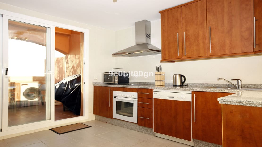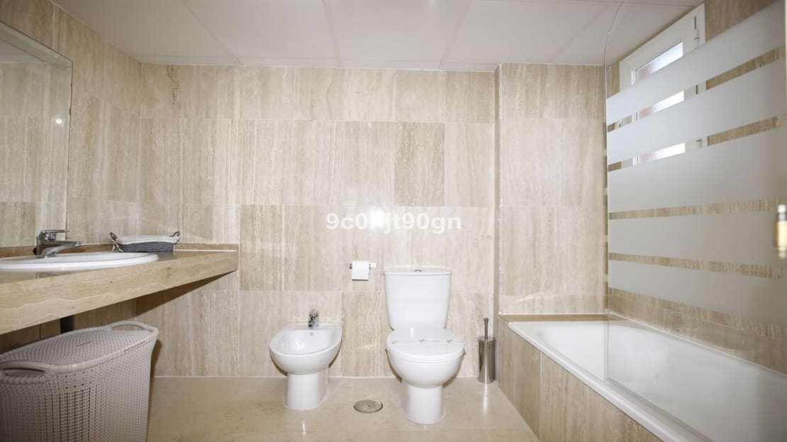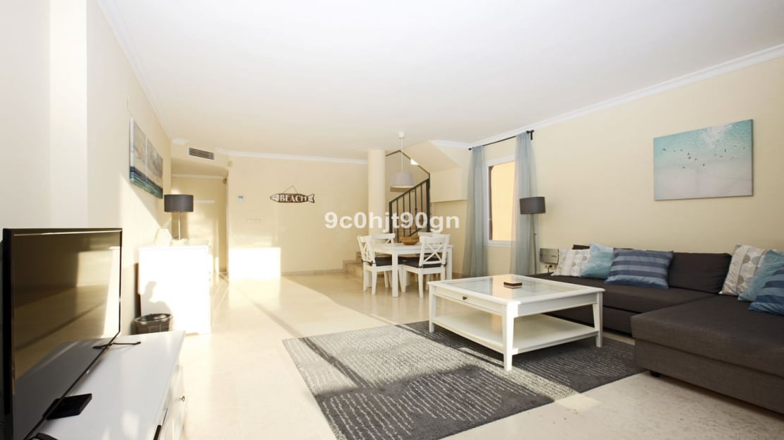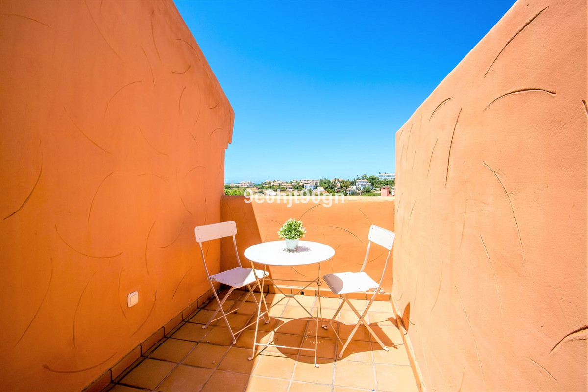 Two bedroom duplex with stunning sea views in a tranquil urbanization near Santa Maria Golf . The lower floor has a large lounge leading onto the terrace and a separate kitchen there is also a bedroom with en suite bathroom .