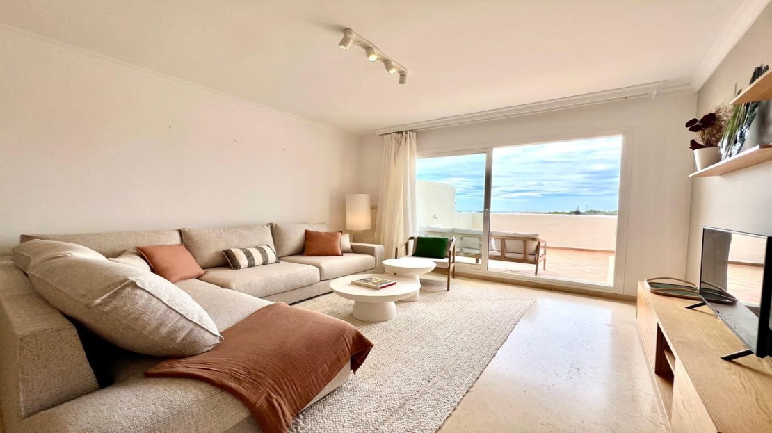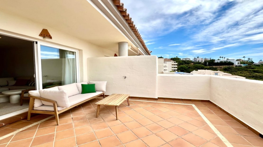 ELVIRIA. BEAUTIFULLY DECORATED AMPLE TOP APARTMENT AT SANTA MARIA GREEN HILLS. 2 BEDROOMS AND 2 BATHROOMS. SOUTH FACING OPEN TERRACE WITH OPEN VIEWS TO THE COUNTRY AND THE COMPLEX. 5 COMMUNAL POOLS PLUS AND ONE HEATED FOR THE WINTER SEASON. MARBLE FLOORS THROUGHOUT. AIR CONDITIONING. ONE AMPLE PARKING SPACE OF 33M2. LIFT. GATED COMPLEX. CAMERA CIRCUIT FOR SECURITY. WELL KEPT COMMUNAL AREAS AND GARDENS. BUILT IN 2005.