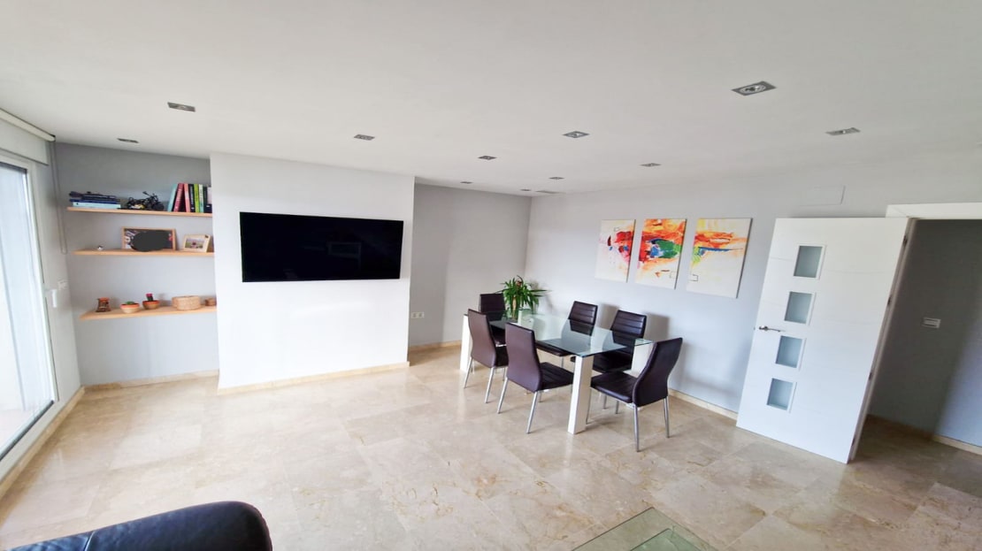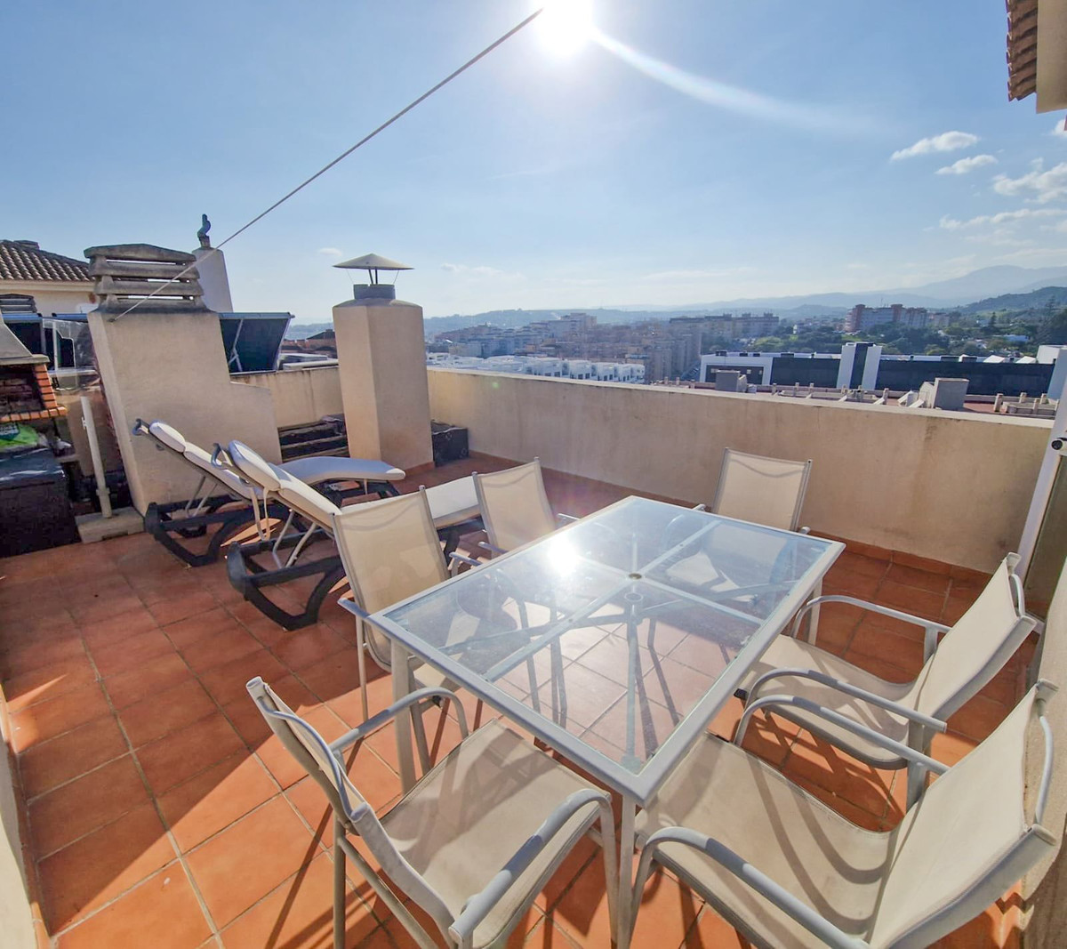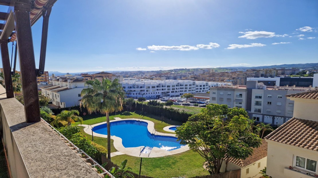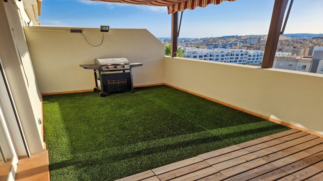 Stunning 2 bedroom duplex penthouse with large terrace, a private solarium, barbecue and incredible views of the sea and the Rock of Gibraltar. A large entrance hall welcomes us to the penthouse. From here we access the bright and sunny living room with access to the terrace overlooking the pool and gardens. Through a staircase we access the large solarium with stunning panoramic views towards Gibraltar and a barbecue, perfect for summer lunches and dinners with family and friends or simply to enjoy pleasant al fresco dinners. The kitchen is independent and fully equipped and leads to a good-sized laundry room. The master bedroom has its own en-suite bathroom with a bathtub and dressing room. The second bedroom is spacious and has an adjacent bathroom with a shower.