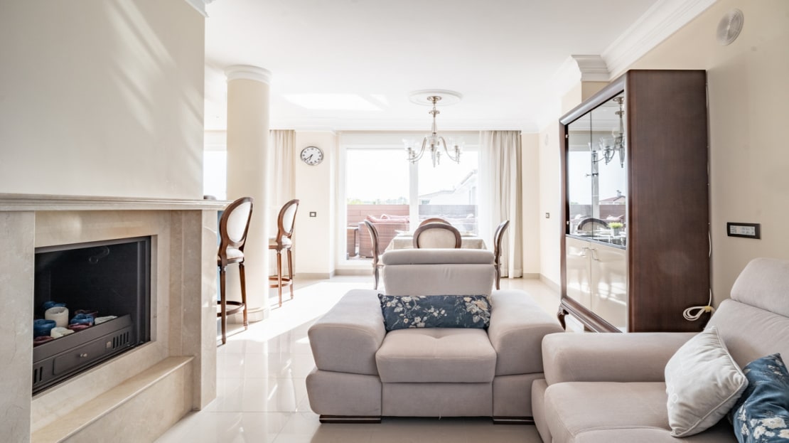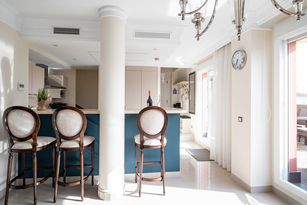 The living area is captivating and brightly lit through extensive windows and sits adjacent to the open plan styled kitchen, which offers a breakfast bar and bar stools for convenience. The dining area sits alongside the kitchen and is bright and airy , enjoying direct access out onto a vast terrace.