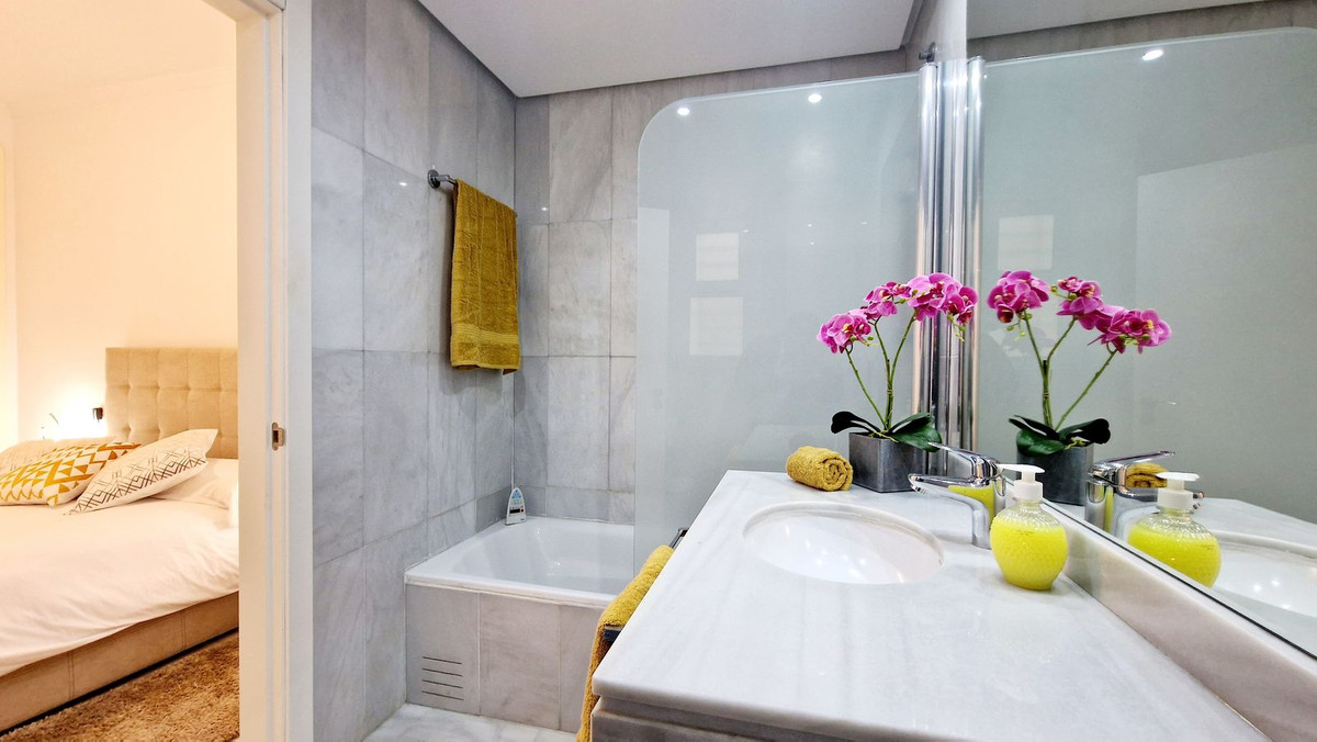 This stylish apartment boasts a modern design with energy-efficient LED lighting throughout. The fully equipped kitchen features brand-new appliances, perfect for effortless cooking and entertaining. Both bedrooms include fitted wardrobes for ample storage, while the primary suite offers the added luxury of an en-suite bathroom.
