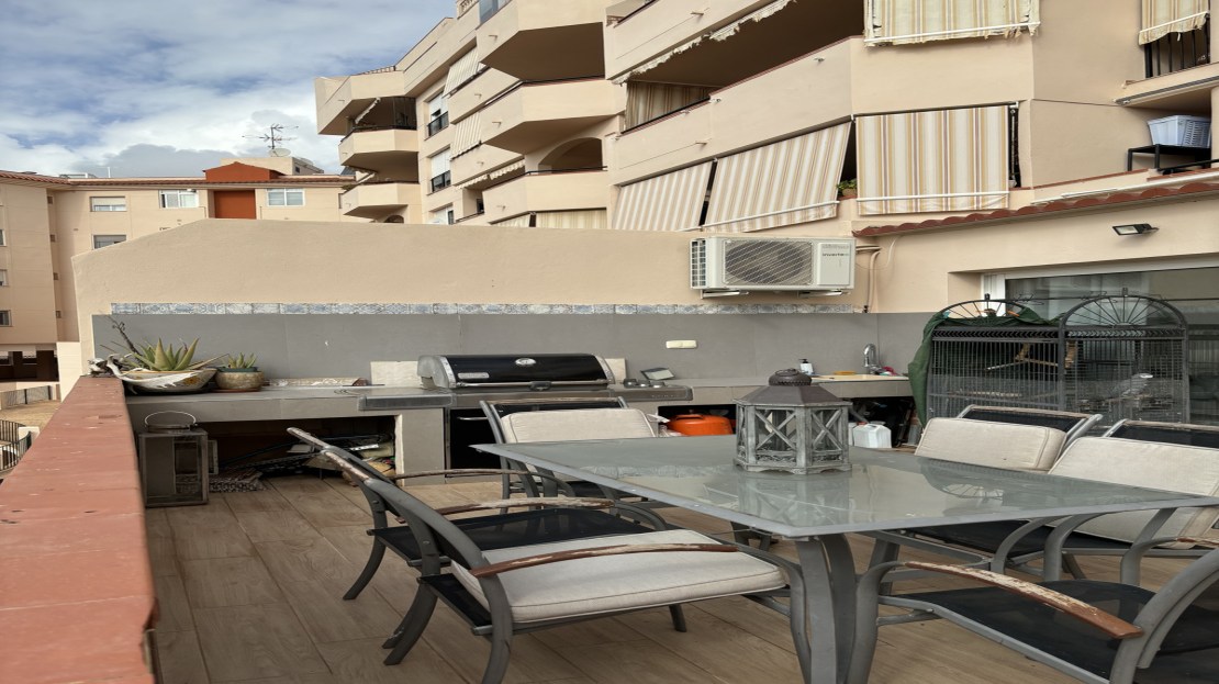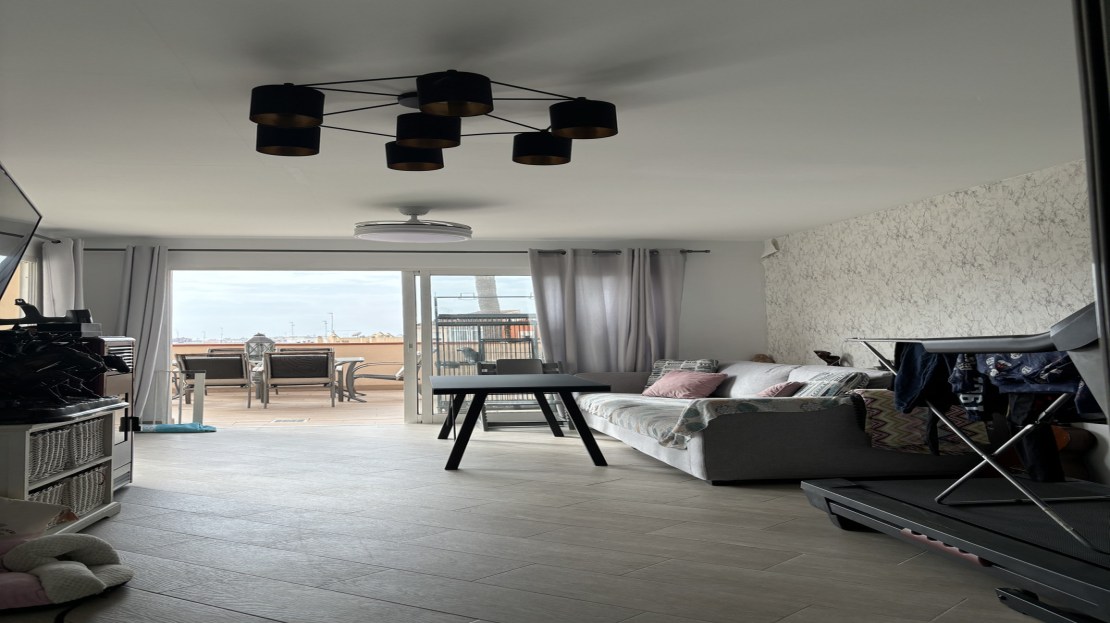 Inside, the apartment features a generous living room with an open-plan kitchen that seamlessly flows into a second sitting area, which opens up to the expansive terrace. Both bedrooms are well-sized, with the master bedroom including a spacious walk-in closet and a private en-suite bathroom. The second bedroom offers a built-in wardrobe and shares a full second bathroom, which is fitted with a luxurious jacuzzi.