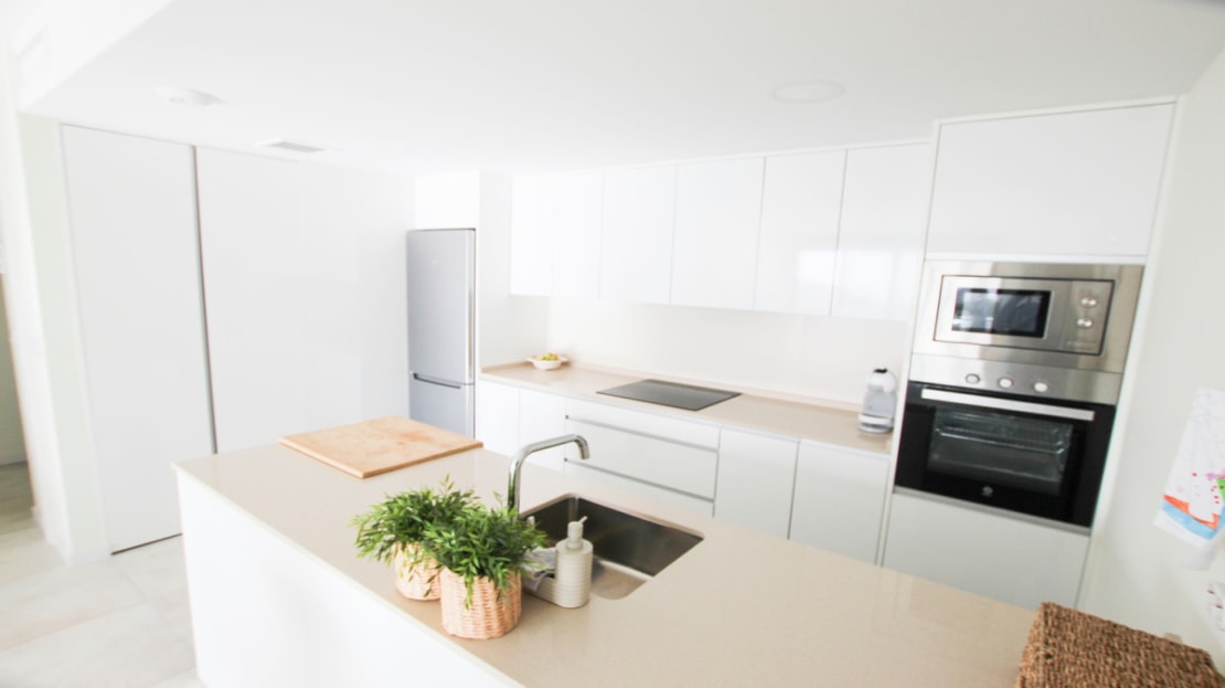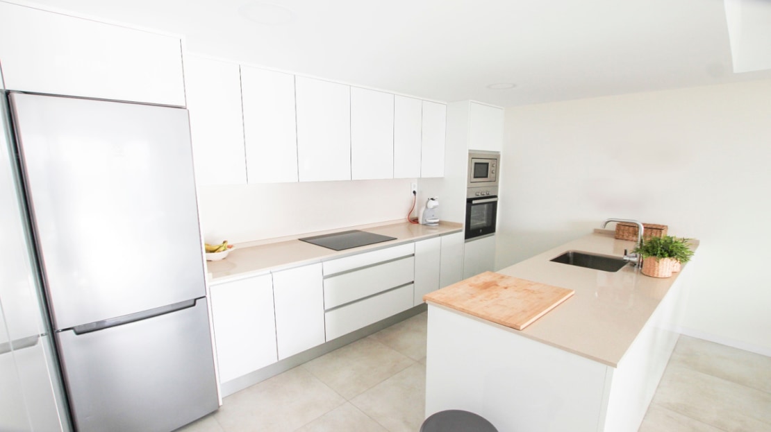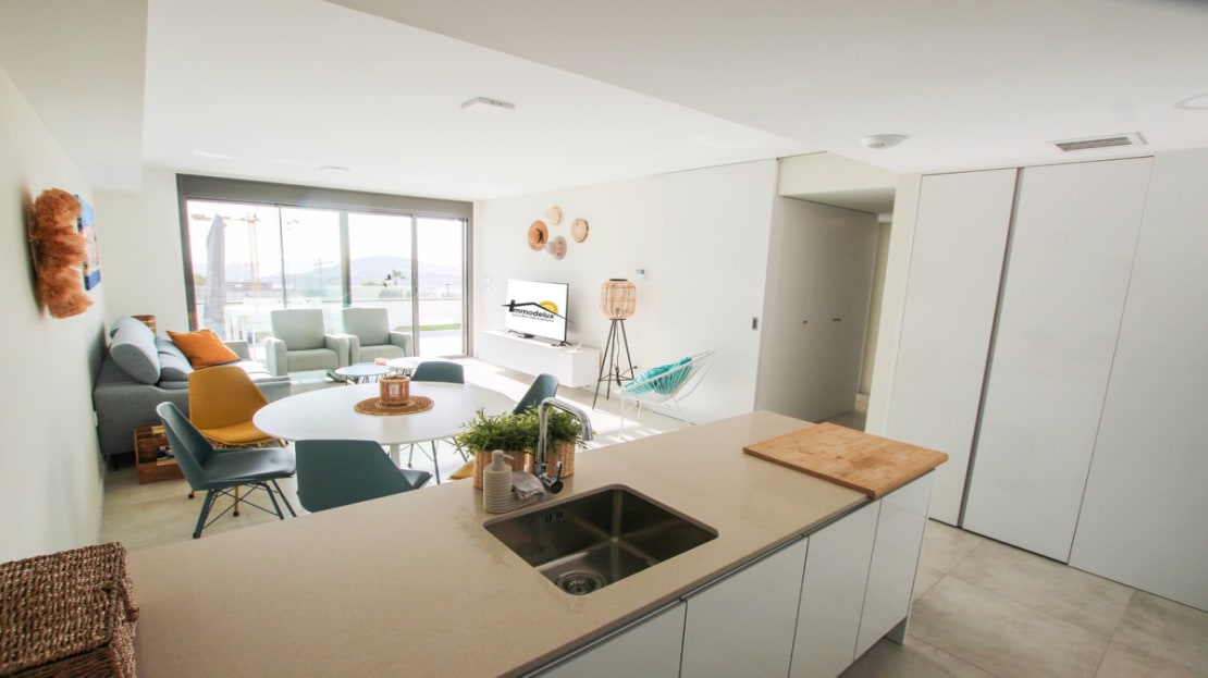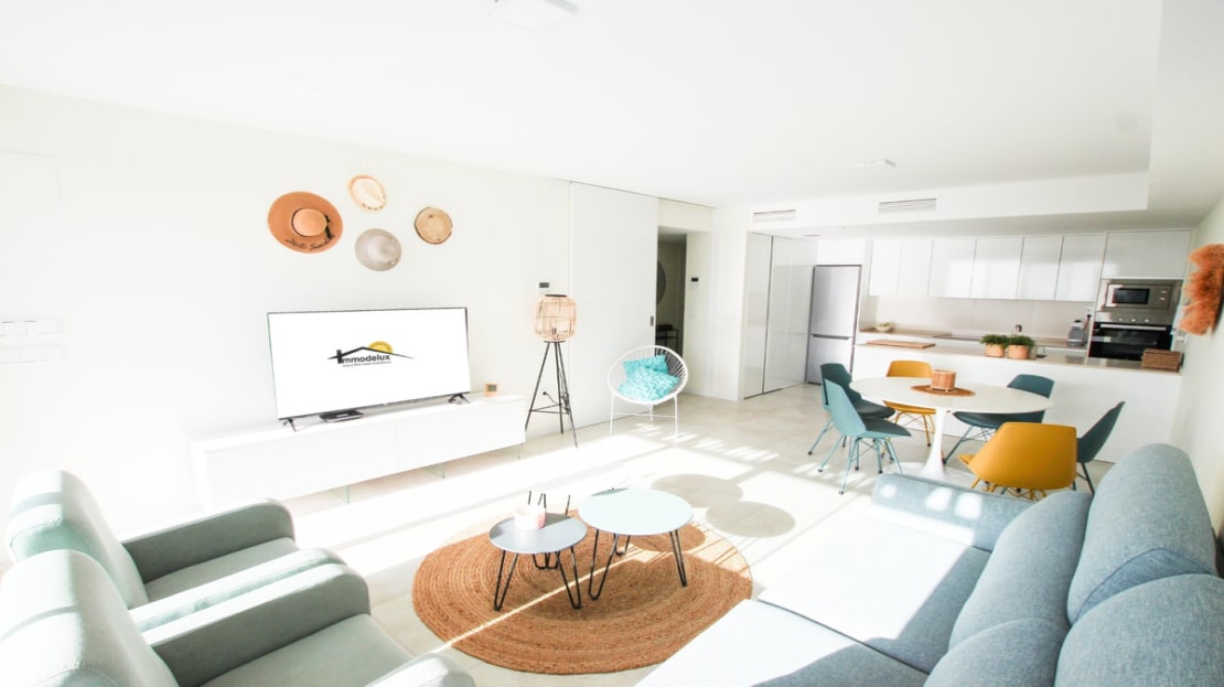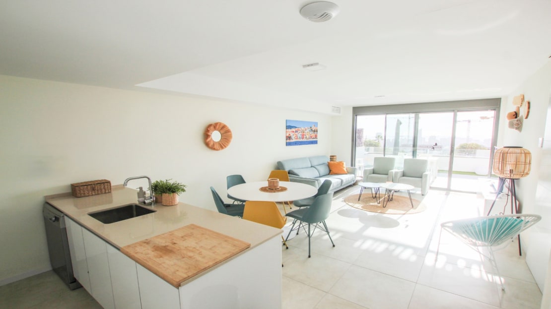 Spacious living room with open kitchen. The latter is equipped with all the necessary equipment. From the living room you have direct access to the spacious terrace.