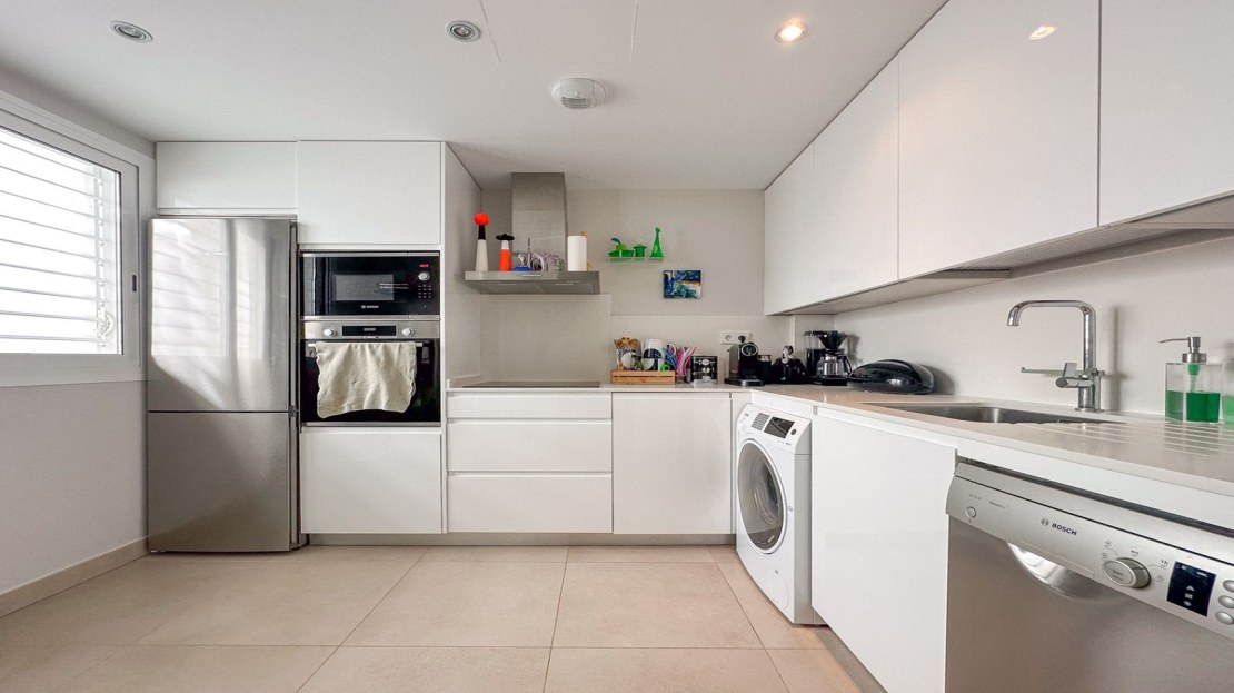 The terrace on the ground floor is 31.5 m², of which 11.4 m² is covered, here you can enjoy the sun from the morning until it sets. The large size of the terrace makes it possible to have lounge furniture, a large dining table, sunbathing, there is also the possibility of a cold bath undisturbed by neighbours. In the evening, there is the opportunity to see the sun set behind the Mijas mountains, as well as a view over the Mediterranean Sea, Fuengirola town and the mountain peaks. In addition, there is a nice large well-functioning kitchen and toilet.