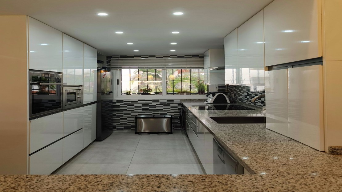 Sleek open-plan designer kitchen, fully renovated and fitted with high-end appliances.
