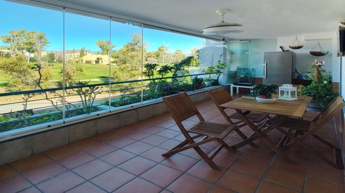 Expansive terrace with glass curtains, providing year-round comfort and breathtaking views of the Guadalmina golf course.