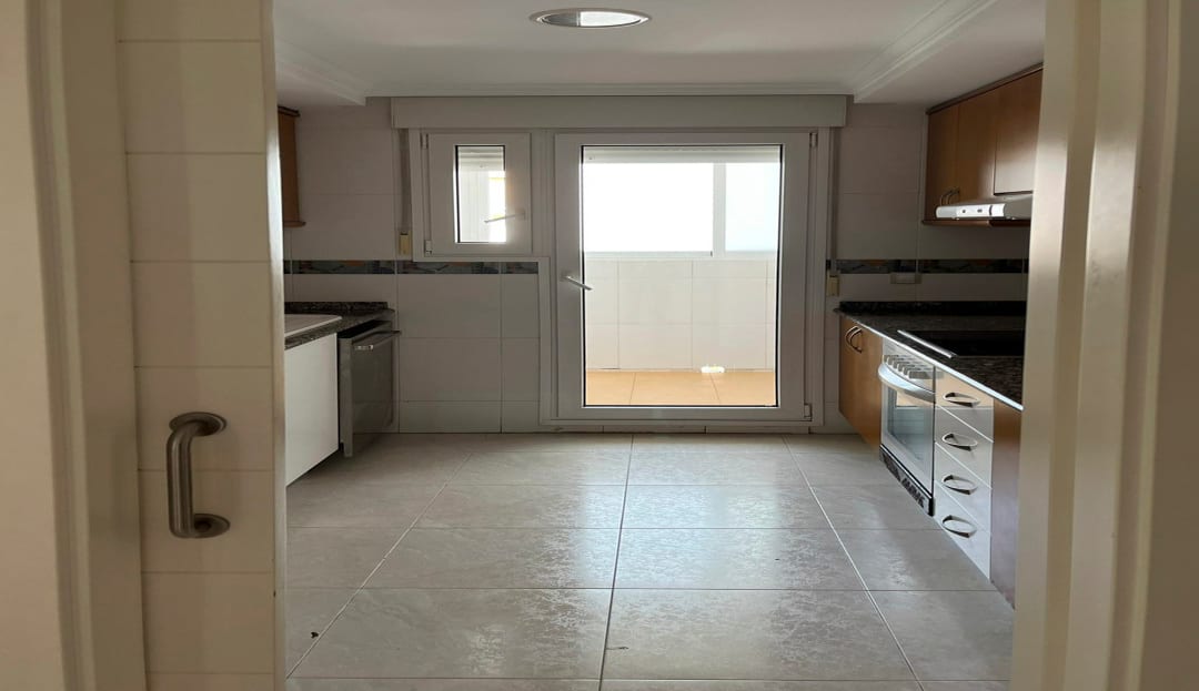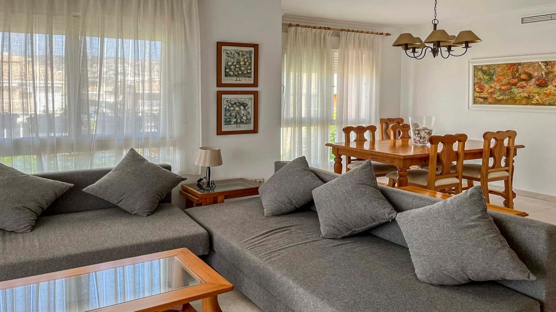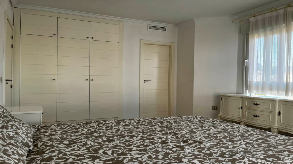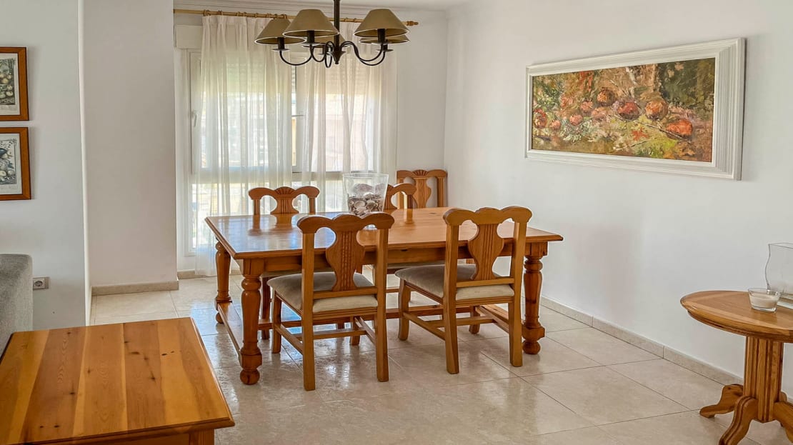 This flat is located on the second floor of a well-kept apartment building close to the sea and the city centre. The flat comprises a spacious living-dining room, a kitchen with an adjacent laundry room, a double bedroom with an en suite bathroom and a double bedroom with a separate bathroom. In addition, there is a 22 m2 covered terrace. The apartment complex has a large, communal swimming pool surrounded by a grassy garden with palm trees. The beach can be reached on foot in 5 minutes. Both the port and the city centre can be reached in 15 minutes.