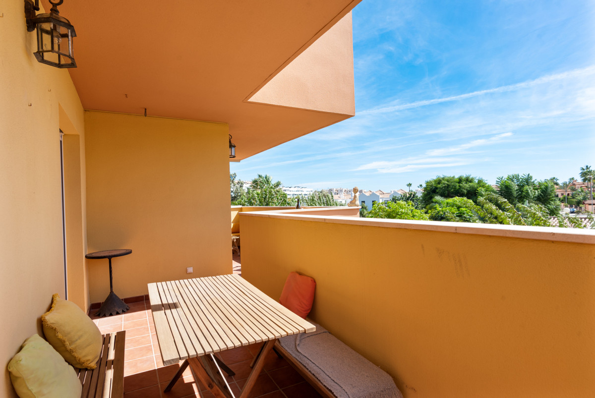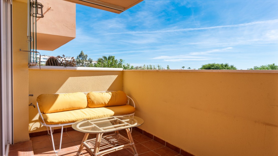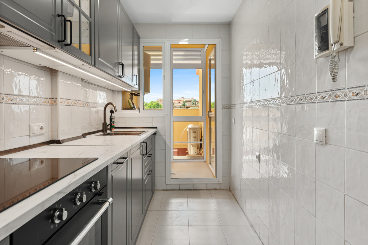 This first floor property has open views over the pool and gardens and a pleasant terrace wrapping around the apartment with access from the living room and both bedrooms. Access from the parking garage or ground floor by elevator, entering the apartment into a hallway with handy storage. The living & dining room is light and spacious with patio doors to the terrace. The pleasant kitchen was recently renewed and has a separate utility room, there is a relatively easy opportunity to open the wall between kitchen and living room to create a large open plan space.