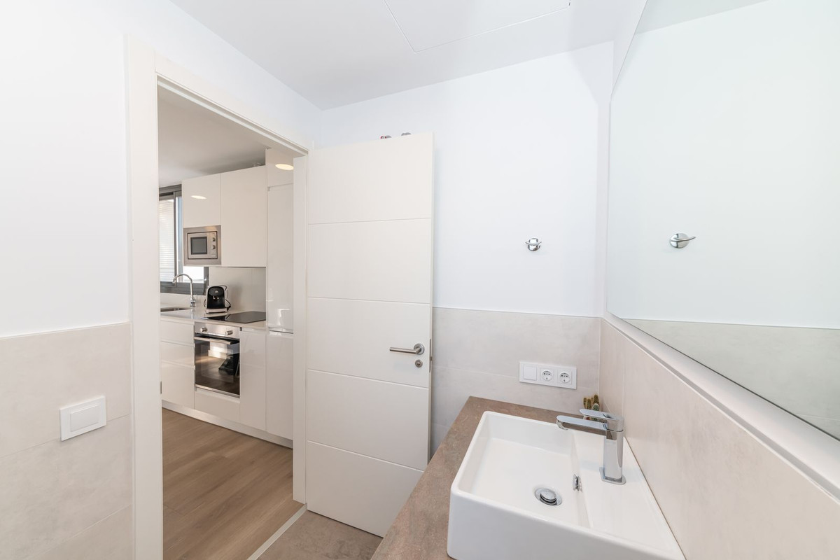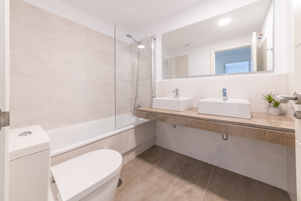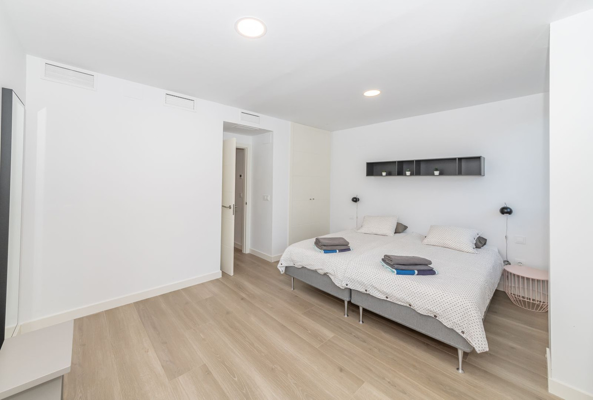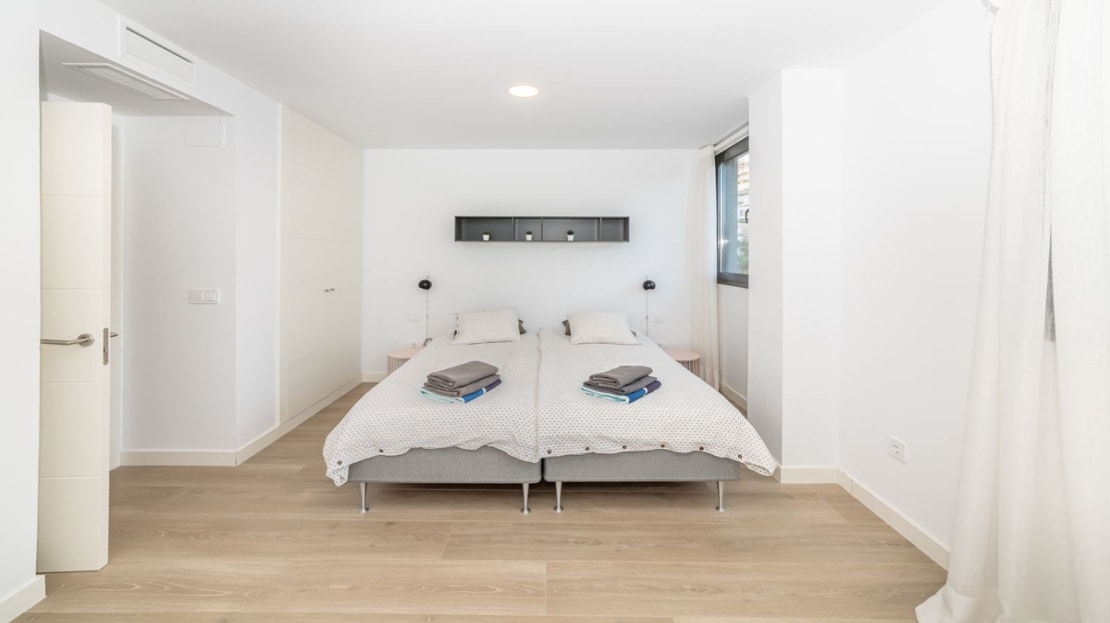 As you enter the apartment there is a very bright and spacious lounge and open modern kitchen with huge patio doors on each side of the apartment, leading to the terraces. There is also a utility room and guest toilet on this level