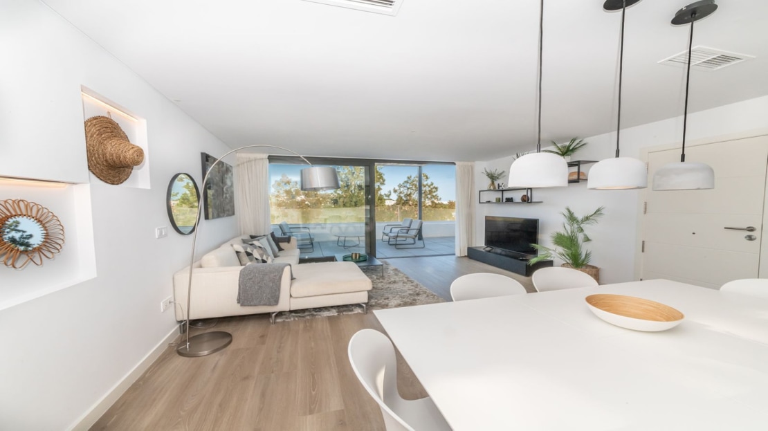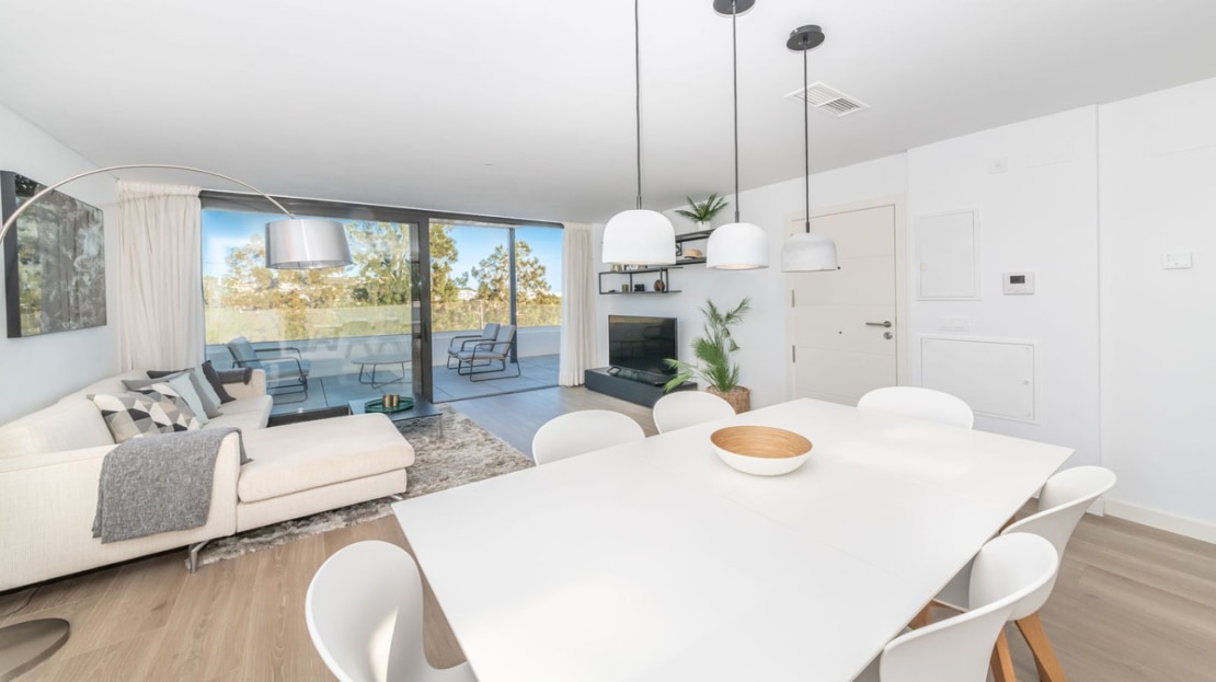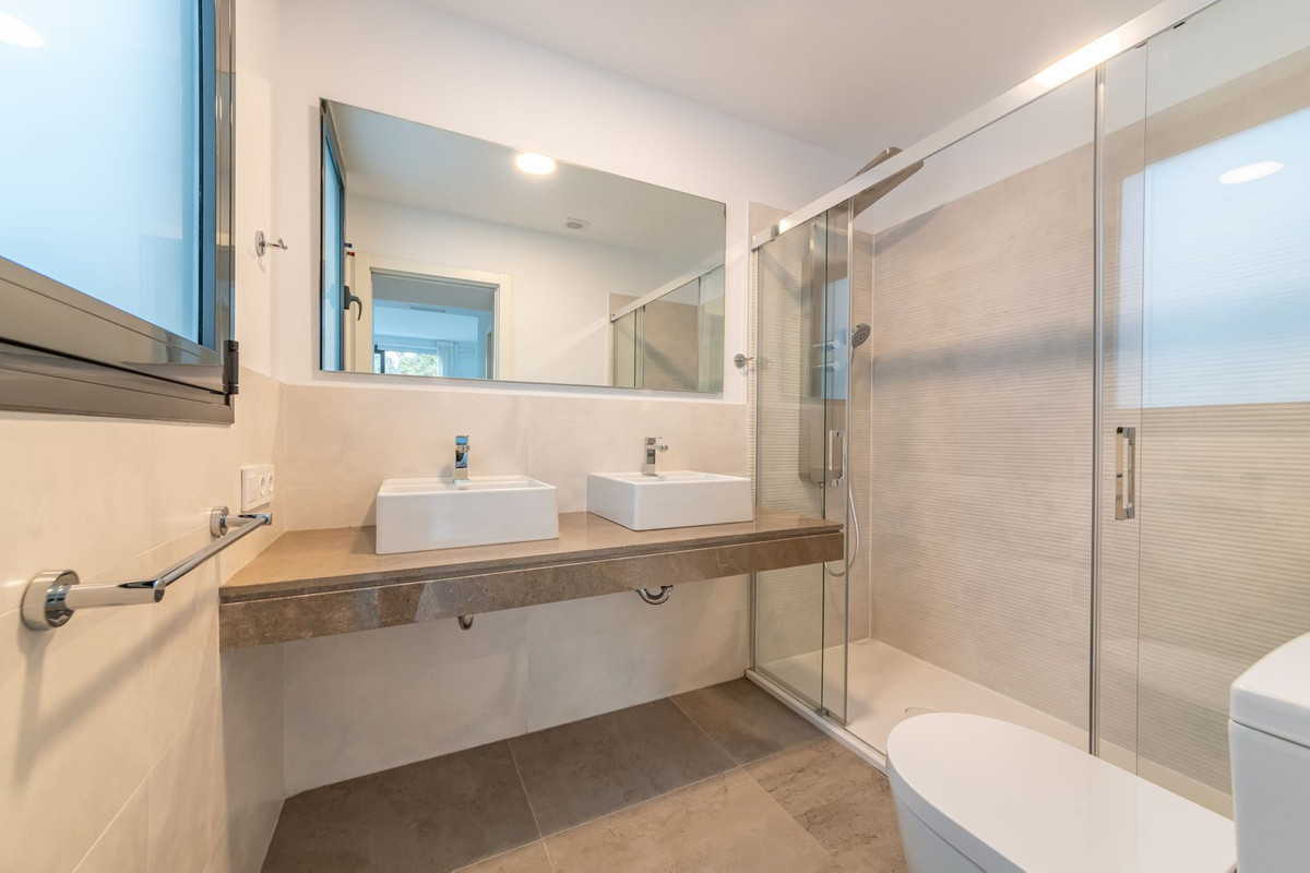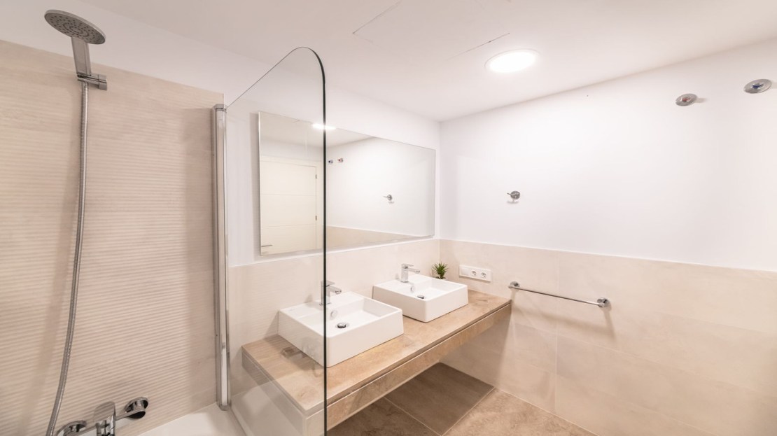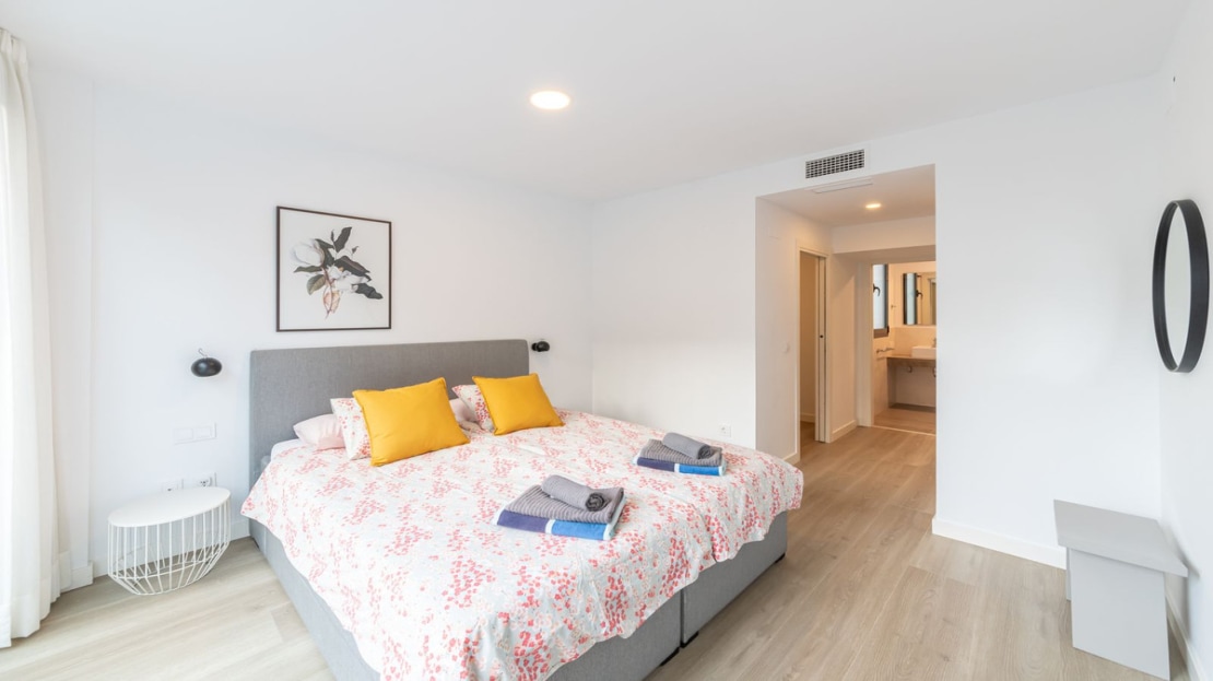 As you enter the apartment there is a very bright and spacious lounge and open modern kitchen with huge patio doors on each side of the apartment, leading to the terraces. There is also a utility room and guest toilet on this level