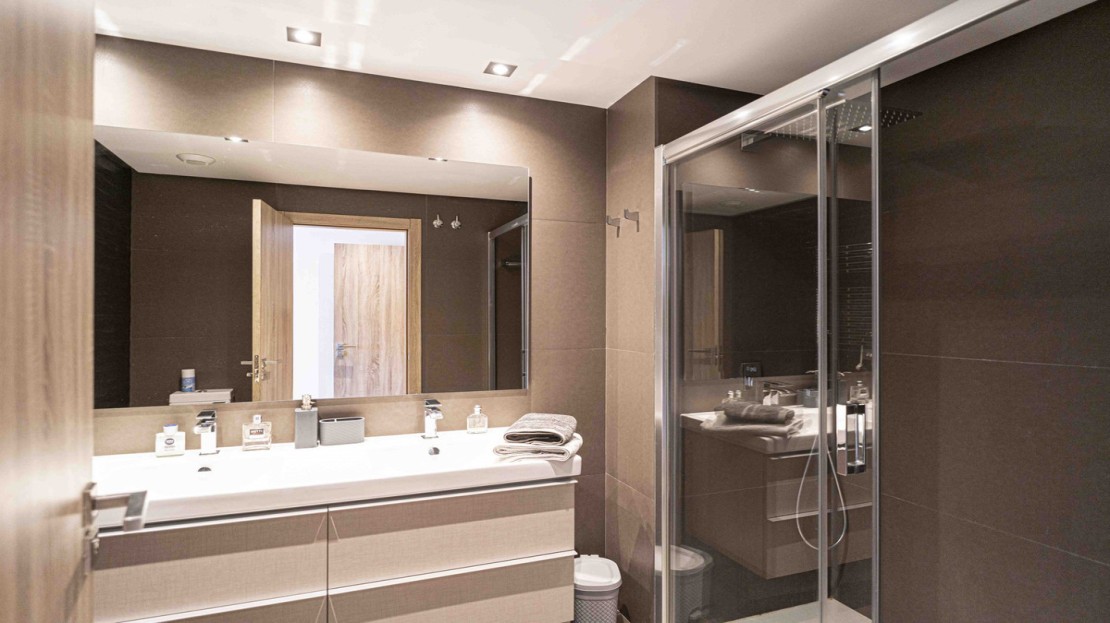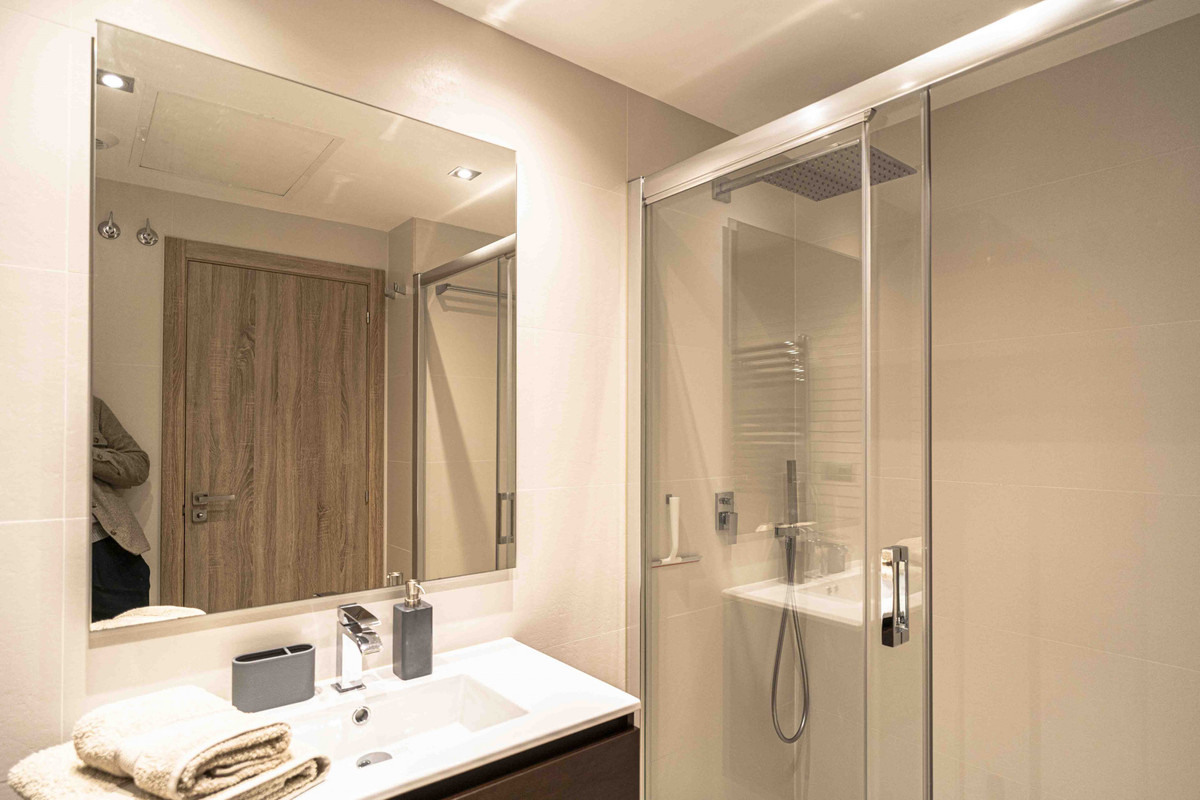 Designer bathrooms fully equipped with glass screen, sink with cabinet and mirror.