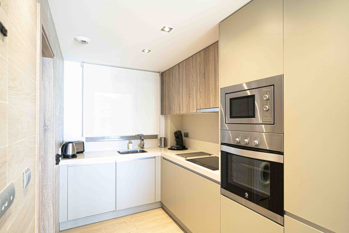 Very bright living room with fully equipped semi-open kitchen separate from the living room with a sliding door, a laundry room included in the kitchen.