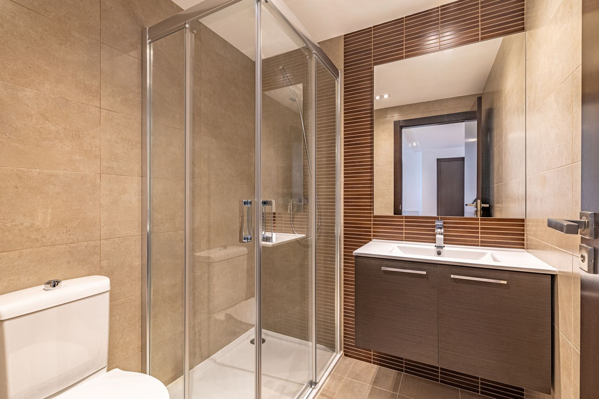 The apartment has upgraded equipment such as tumble dryer, glass shower walls and new spotlights.