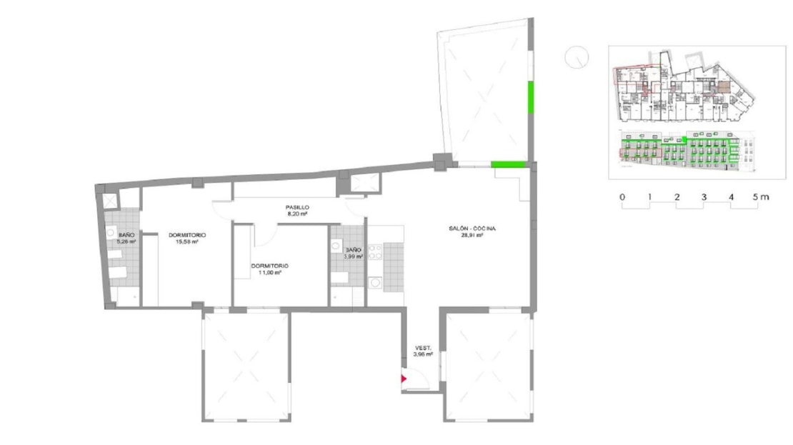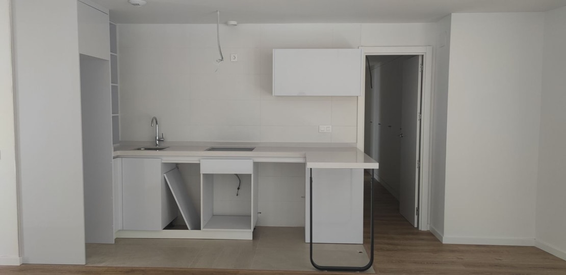 It is a 92 m2 flat with two bedrooms, an open plan fitted kitchen (without electrical appliances) and two bathrooms, one of them ensuite. In all rooms and in the hallway, there are built-in wardrobes, which facilitates storage. The flat is passed on as received at the final construction completion, so that the new owners can finish it to their own taste, adapting it according to their budget to the style they prefer, if they want to make changes to a functional kitchen and bathrooms and increase the value of the property; although they can also maintain as it is and complement it with a creative decoration.