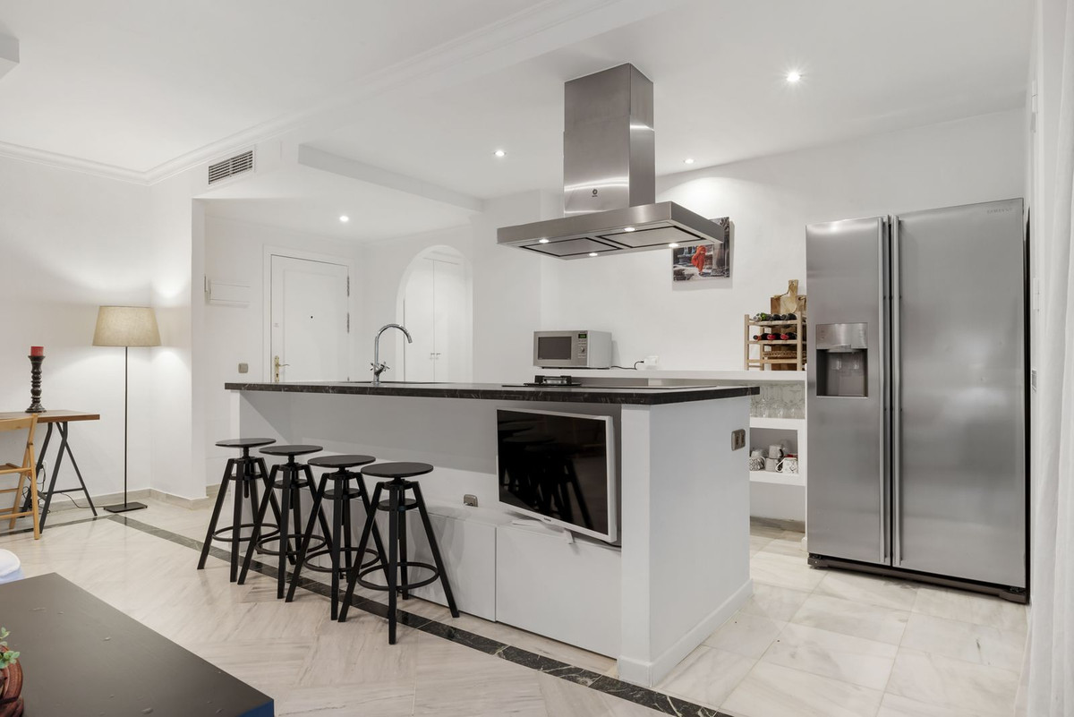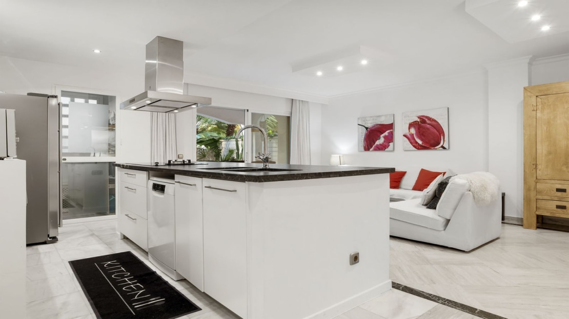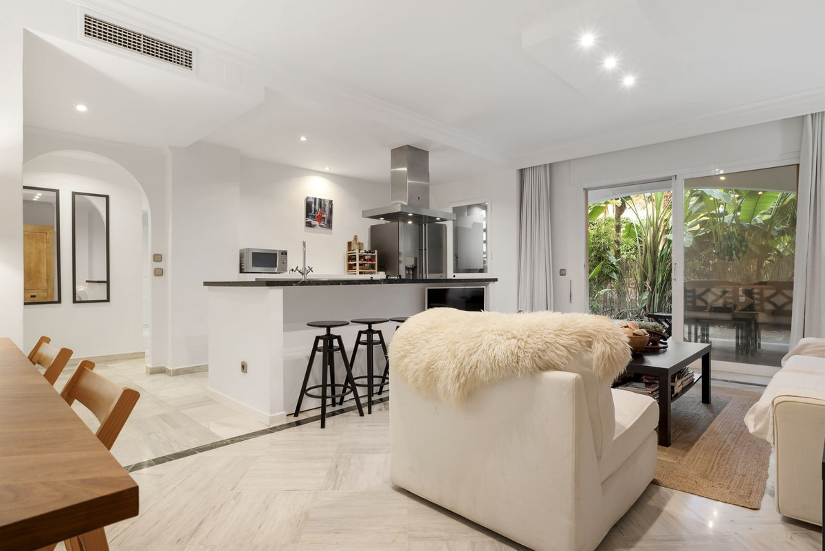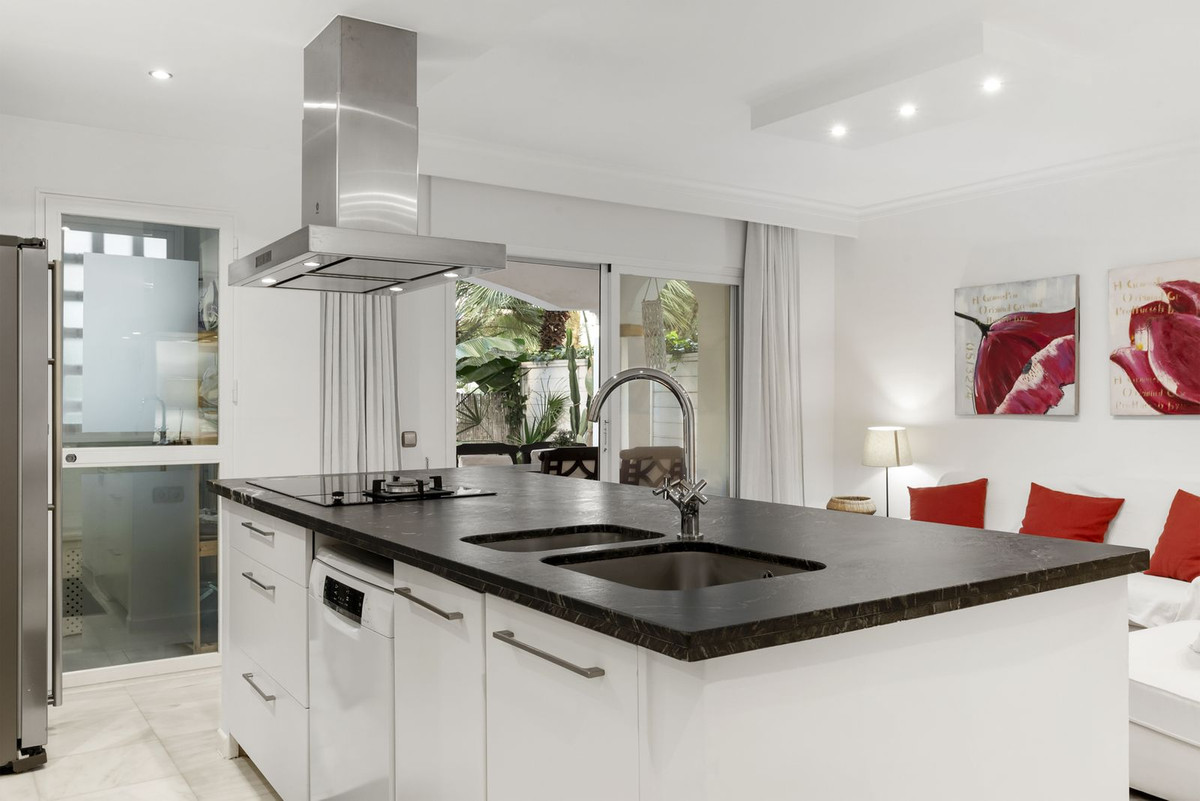 Beautiful ground floor apartment within walking distance of the center and beach in Marbella for sale. The entrance gives direct access to the bright living room with open kitchen and sliding doors to a private terrace. The living room is cozy. The open kitchen, equipped with a very large island, is not only an eye-catcher but also a cozy place to enjoy breakfast together, or a good glass of wine.