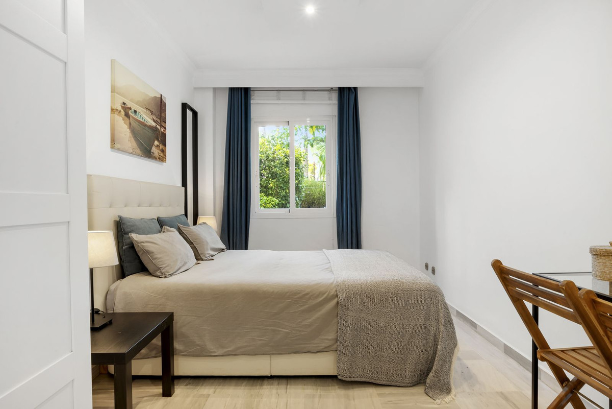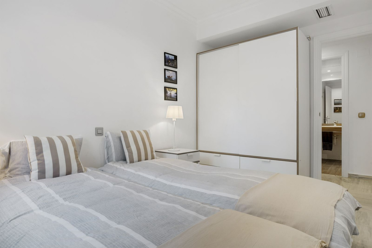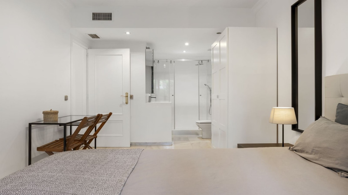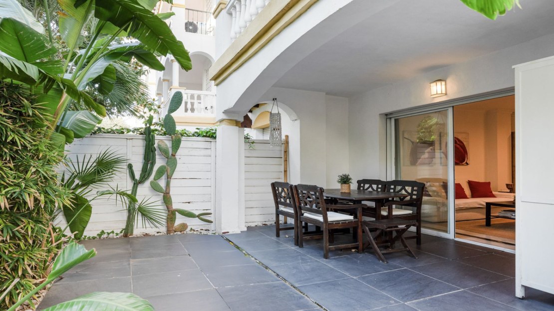 Beautiful ground floor apartment within walking distance of the center and beach in Marbella for sale. The entrance gives direct access to the bright living room with open kitchen and sliding doors to a private terrace. The living room is cozy. The open kitchen, equipped with a very large island, is not only an eye-catcher but also a cozy place to enjoy breakfast together, or a good glass of wine.
