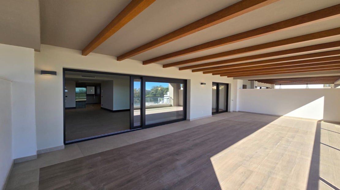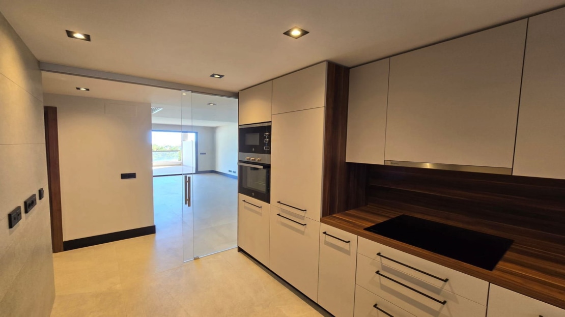 With a large terrace this apartment offers stunning sea and mountain views. The main entrance brings us to the open plan living room from where we access the large and private terrace. Two bedrooms and two bathrooms with the principal en suite. Fully fitted kitchen with branded appliances and separate utility / laundry room. Comfortable modern living including excellent qualities such as air conditioning hot and cold, solar panels, fully fitted open plan kitchen, electric blinds on the windows and thermal protected double glazing. The property includes a large storage room and underground parking.