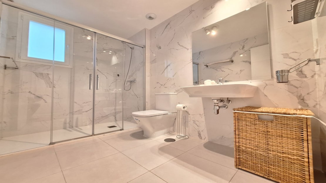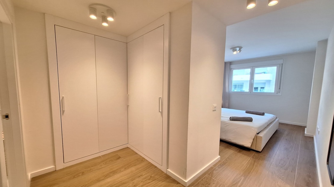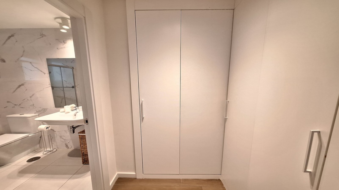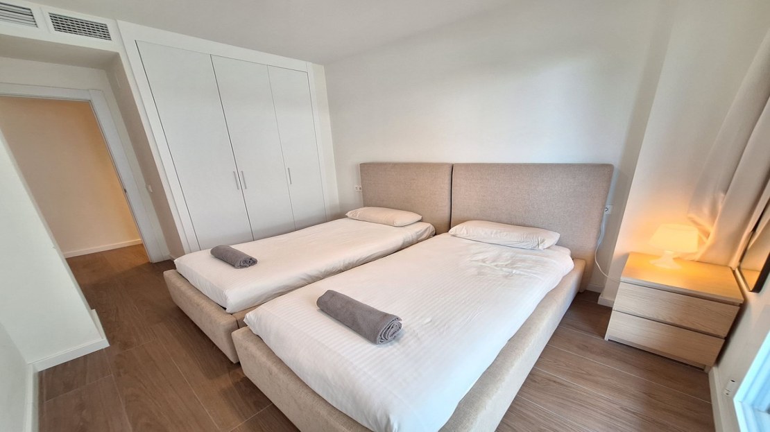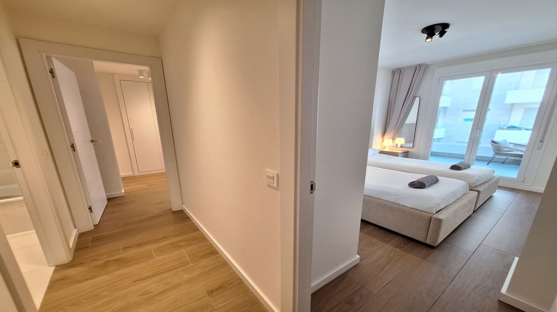 As you move through the property, you have a contemporary bathroom, with bath & shower, with double glazed window. Opposite you have the first double bedroom, with twin beds, fully fitted wardrobes, with direct terrace access.