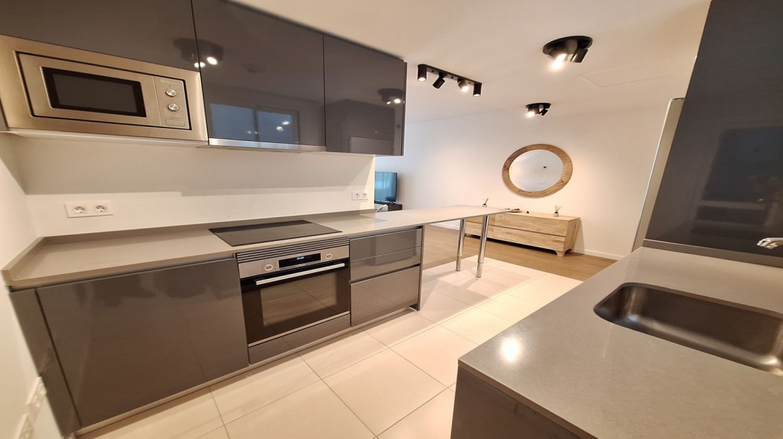 The Living / Dining room is contemporary designed, and furnished by Maison Dumont, and offers lots of natural light throughout. Double gazed terrace doors lead out on to a sunny South East facing terrace, with lateral views of the San Pedro countryside.