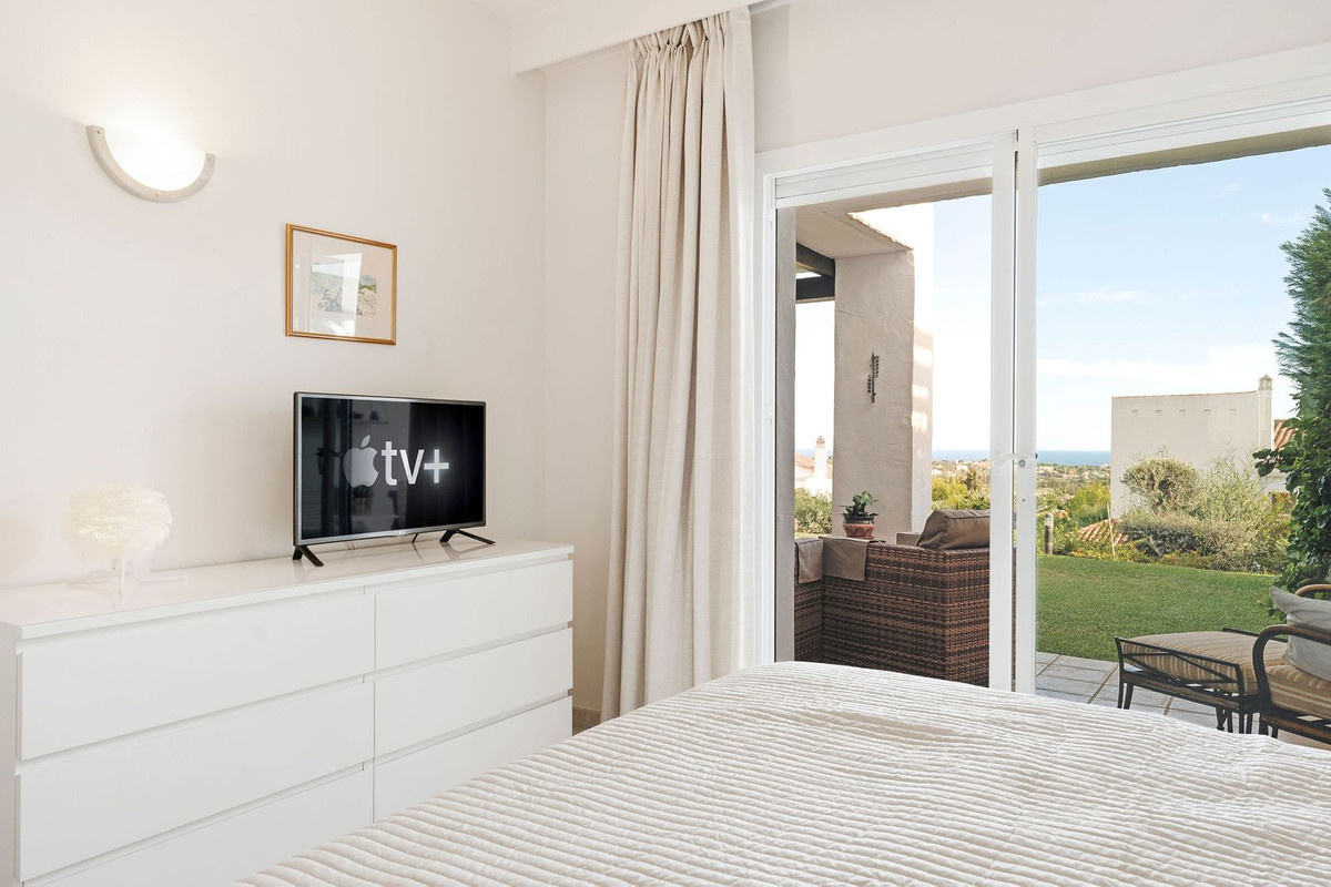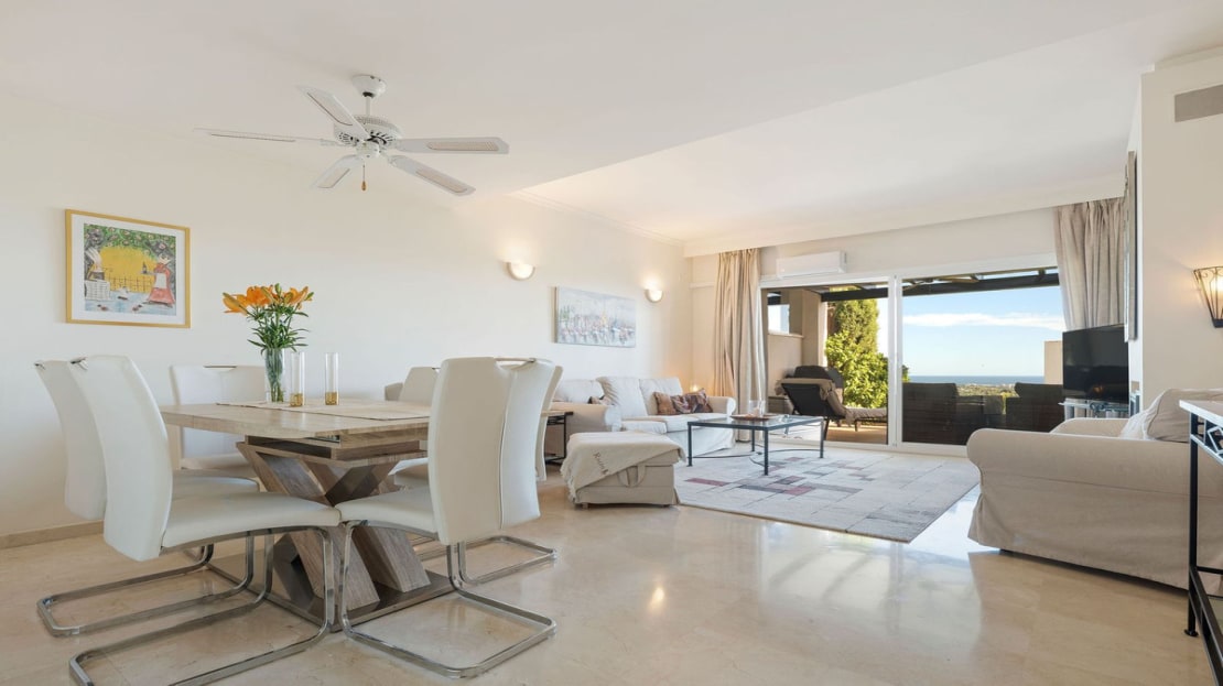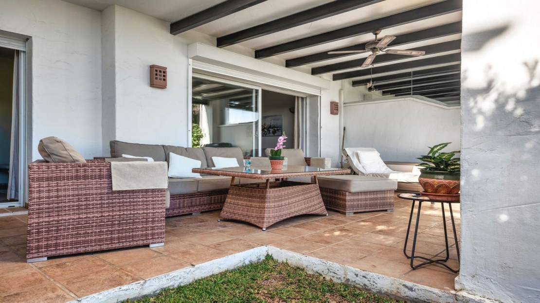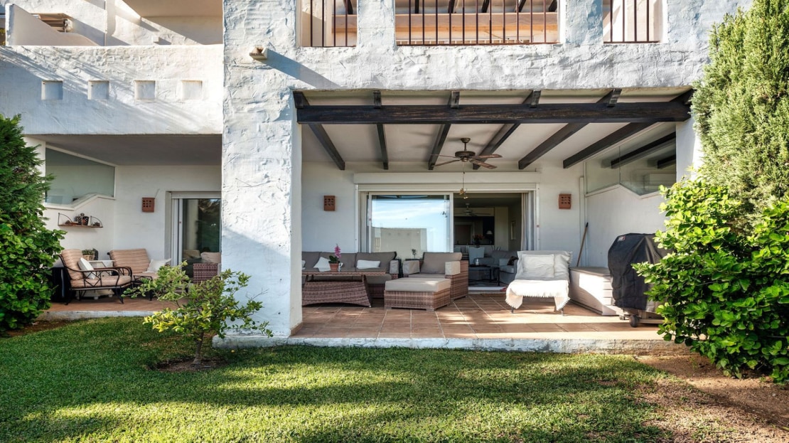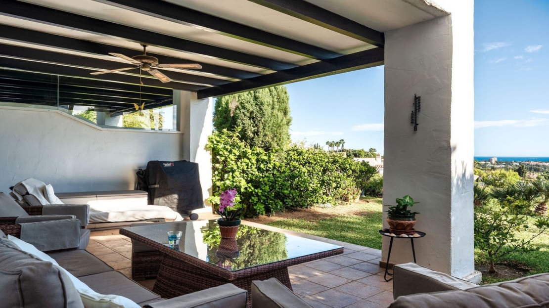 Spacious 2 bedroom ground floor apartment in the popular urbanisation of La Quinta Village. Set in the higher parts of Nueva Andalucia only a few minutes away from Los Naranjos Golf. The spacious layout comprises of 2 bedrooms and 2 bathrooms, the generous sized living and dining room has direct access to the covererd terrace wth sea views as well as a generous garden. Set in a fully gated community you have 2 designated parking spaces just infront of the property. A beautifully well kept communal garden and pool completes this well sized property in a desired area.