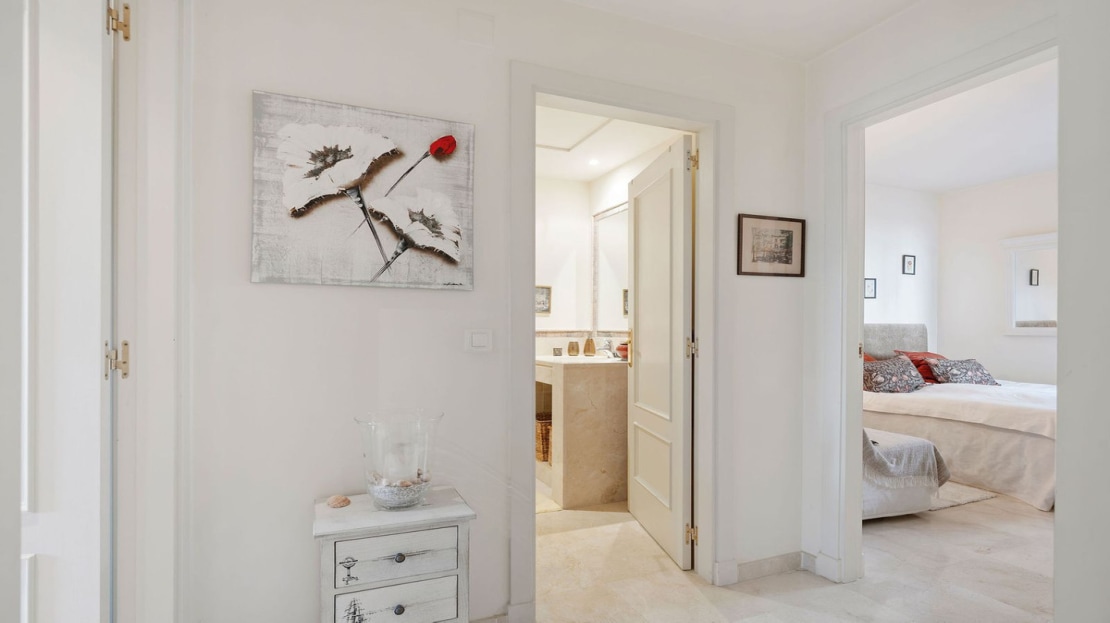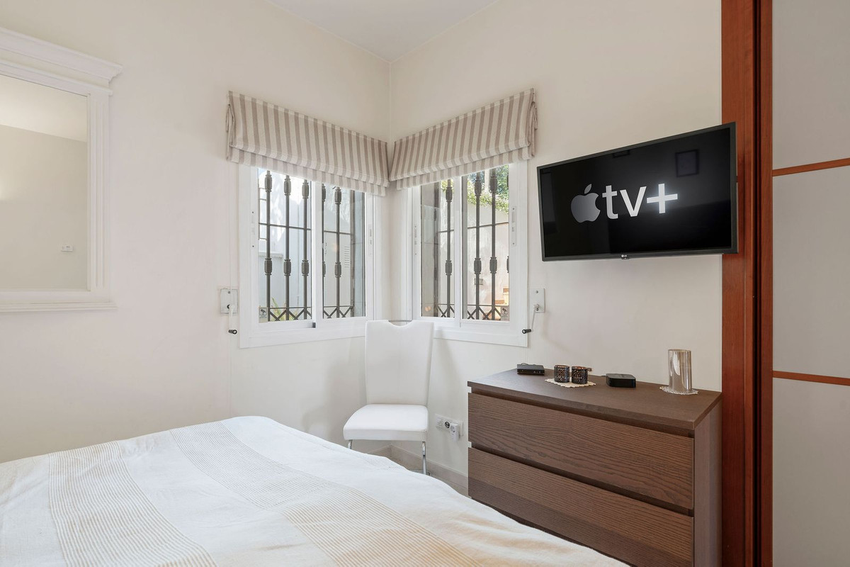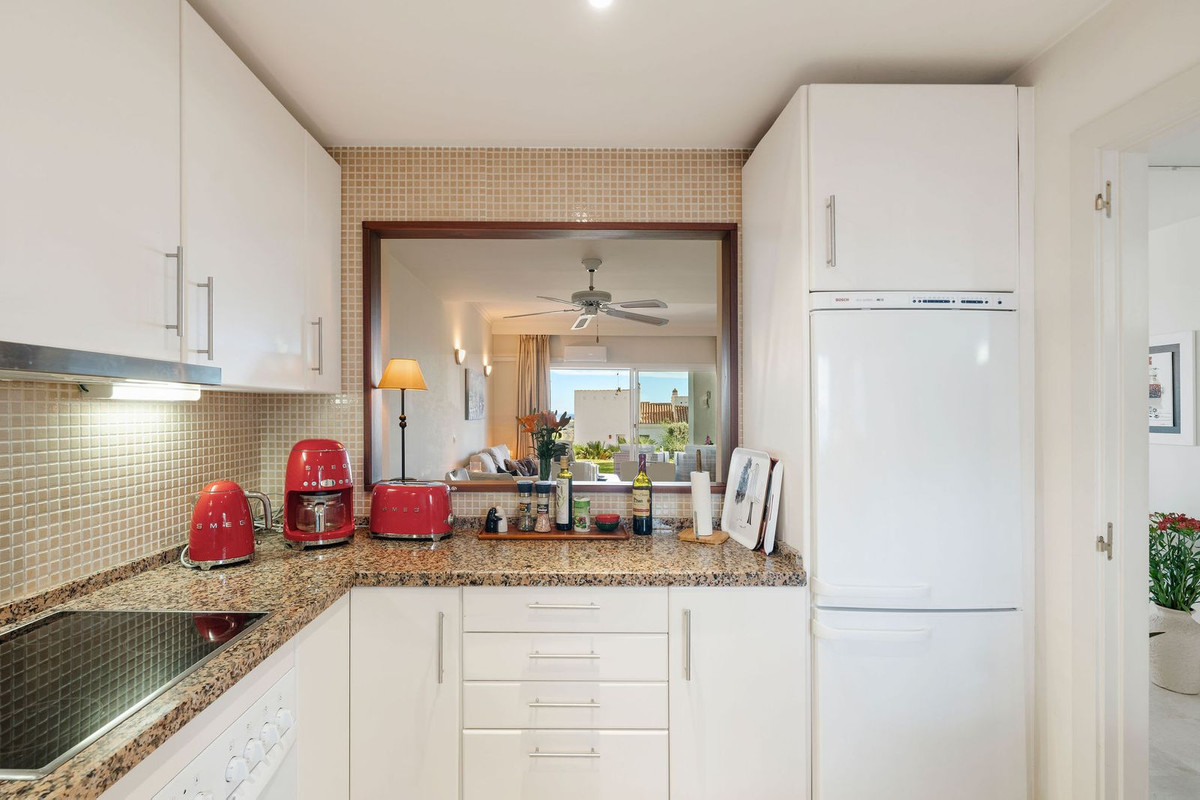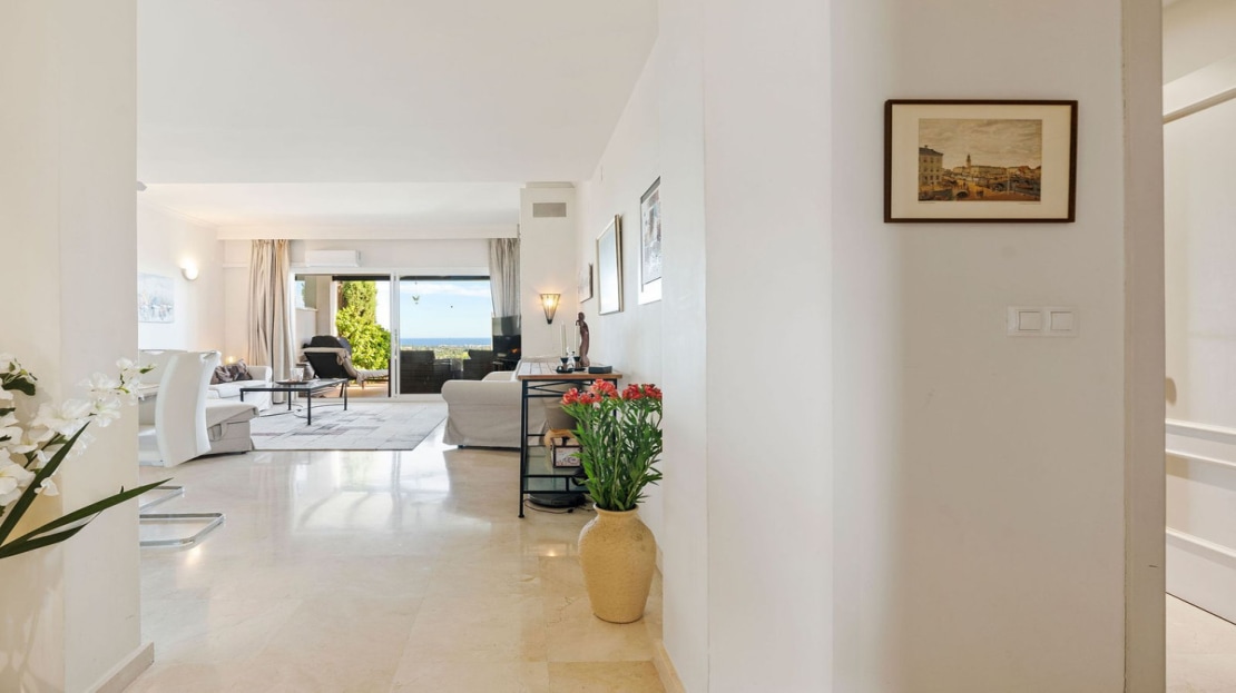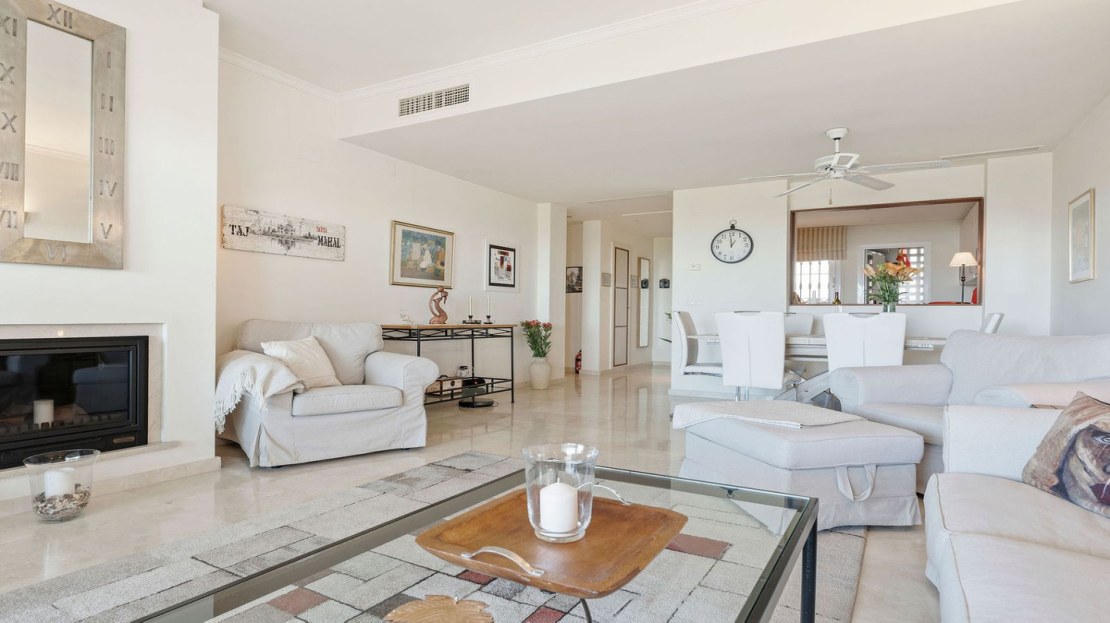 Spacious 2 bedroom ground floor apartment in the popular urbanisation of La Quinta Village. Set in the higher parts of Nueva Andalucia only a few minutes away from Los Naranjos Golf. The spacious layout comprises of 2 bedrooms and 2 bathrooms, the generous sized living and dining room has direct access to the covererd terrace wth sea views as well as a generous garden. Set in a fully gated community you have 2 designated parking spaces just infront of the property. A beautifully well kept communal garden and pool completes this well sized property in a desired area.