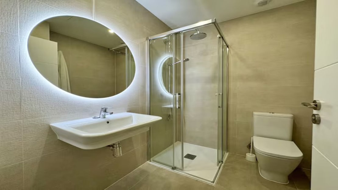Bathrooms. The main bathroom has a toilet, porcelain shower and wall-mounted sink. The secondary with toilet, bathtub and mural sink.
