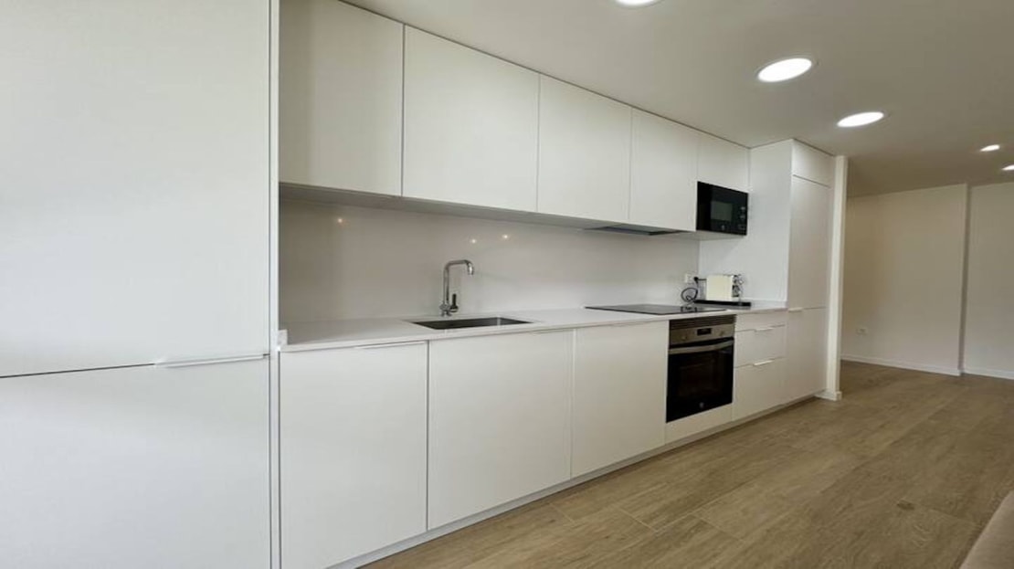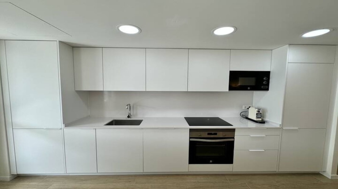 Kitchen. open to the living room , with high and low capacity stratified units, white finishes with handle, Silestone or similar worktop and with electrical appliances.