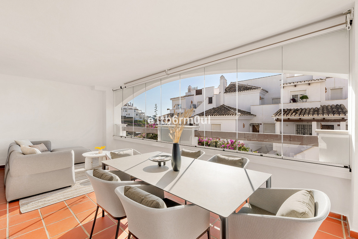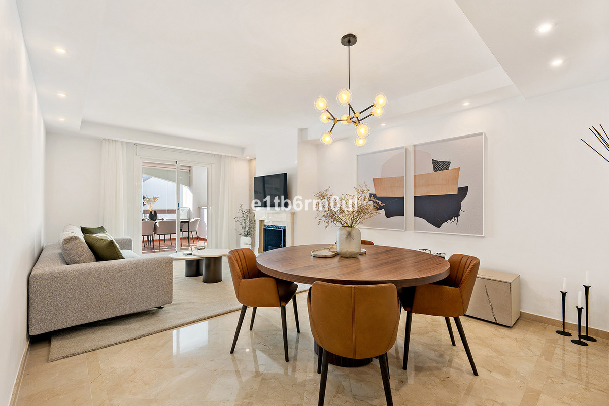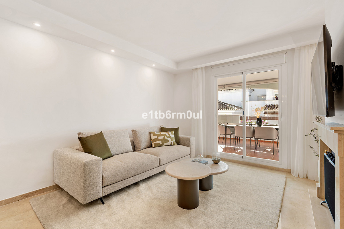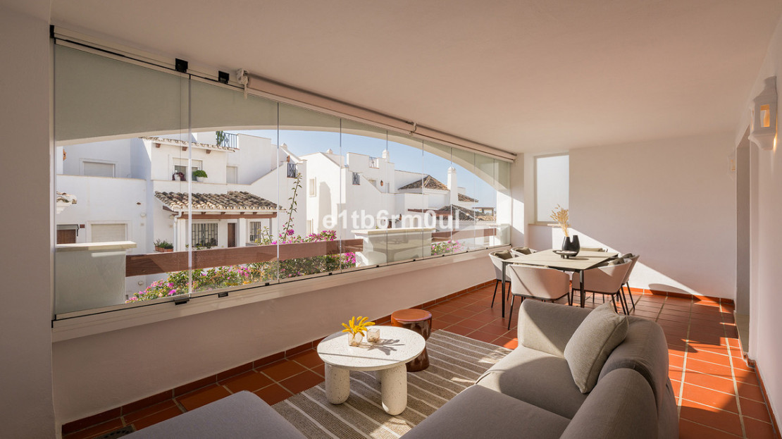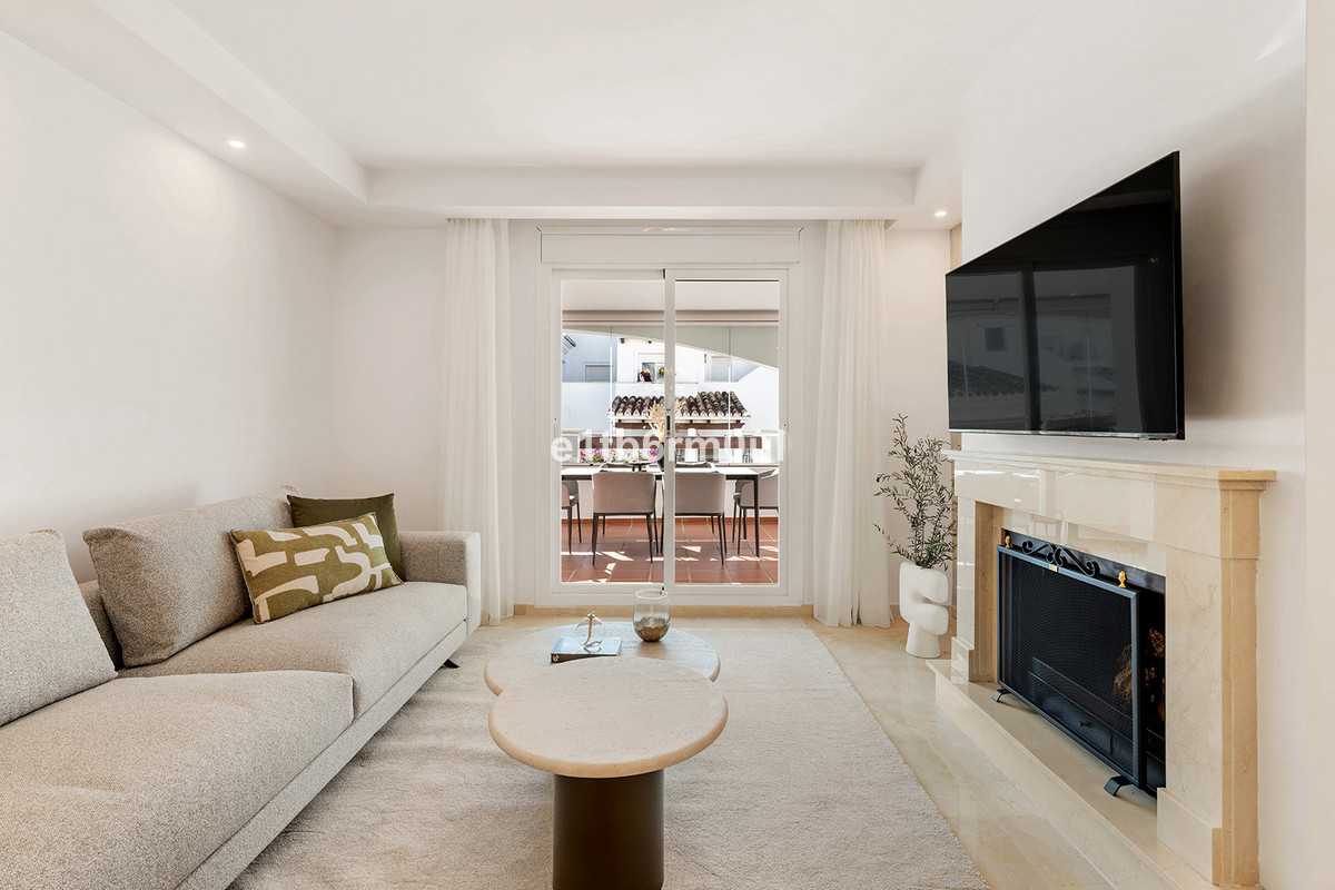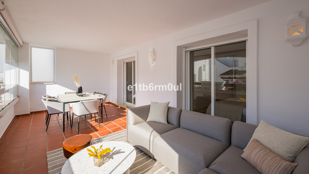 Recently and stylishly refurbished and furnished by Ambience Home Design this beautiful and bright contemporary apartment is located in a beautiful and well-kept community, in the heart of Nueva Andalucia. The accommodation has 2 bedrooms, 2 bathrooms (one of them en suite), a large living-dining room, semi-open kitchen, a large terrace fitted with Lummon-type glazing, allowing all year round use ideal for entertaining friends and family. The community is quiet and peaceful, has two swimming pools, one that is adapted for people with reduced mobility, and lush well-maintained gardens. Included in the price there is a generous parking space and 1 storage rooms. This is an ideal investment, holiday or forever home.