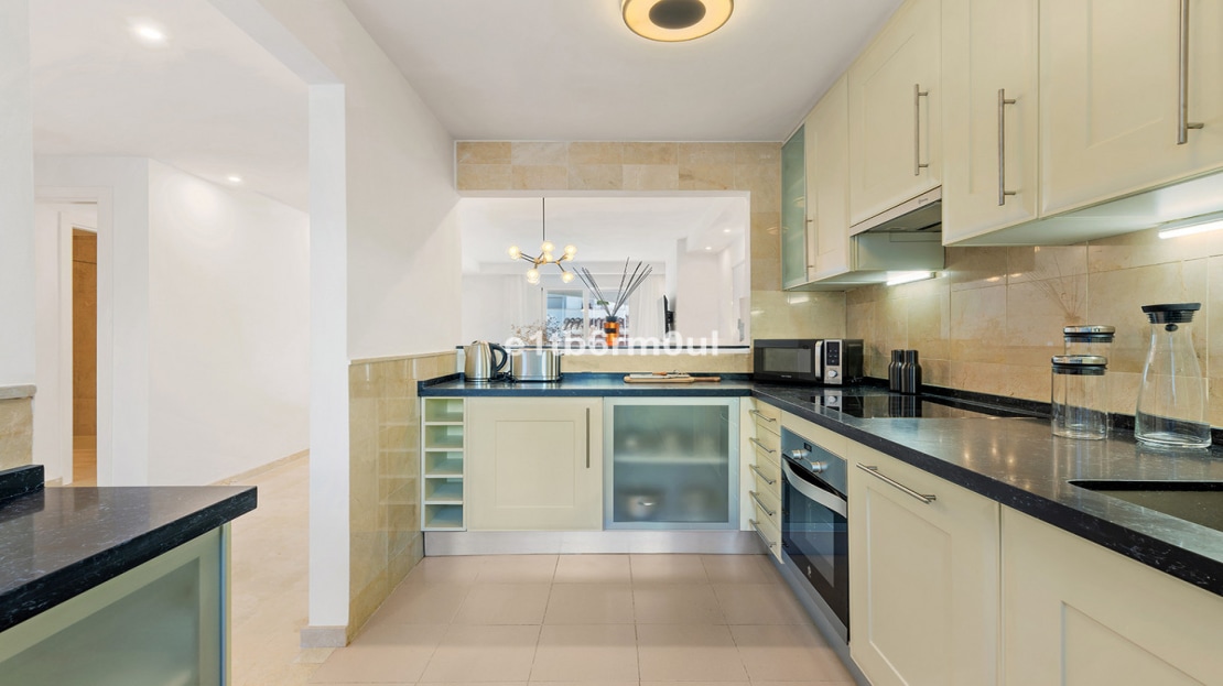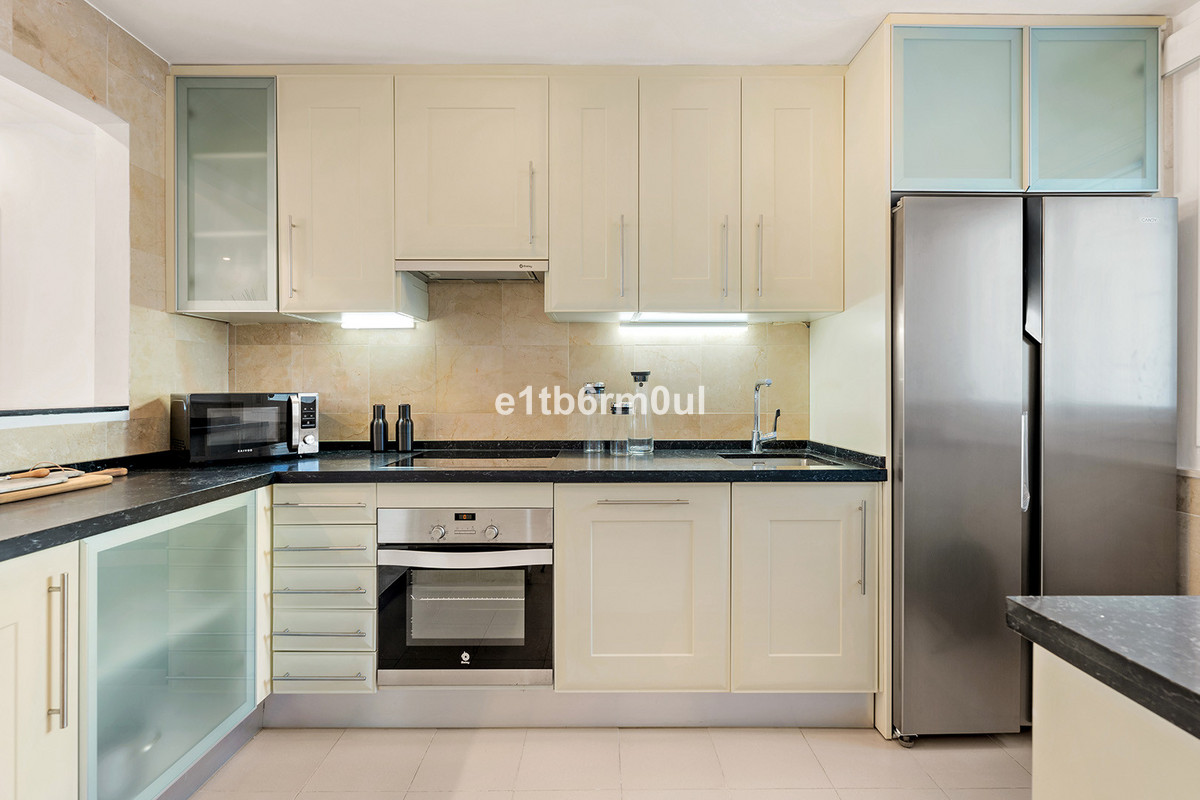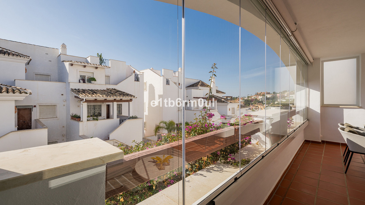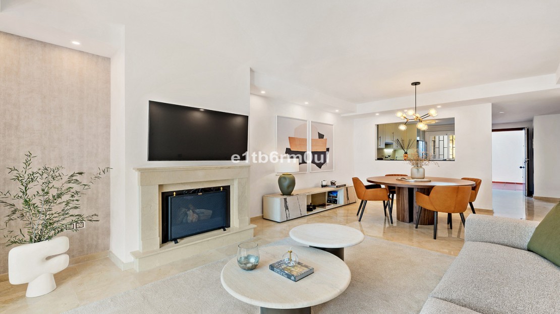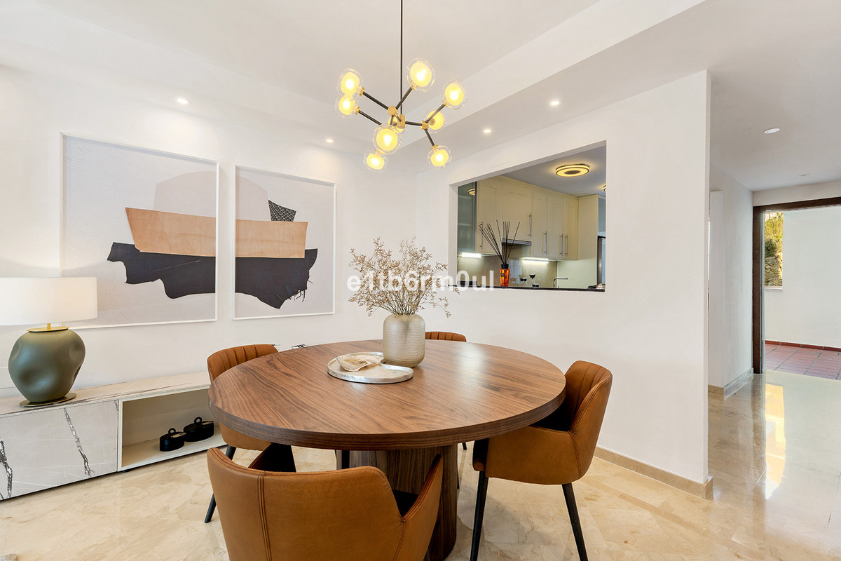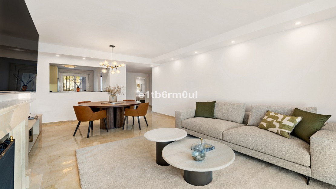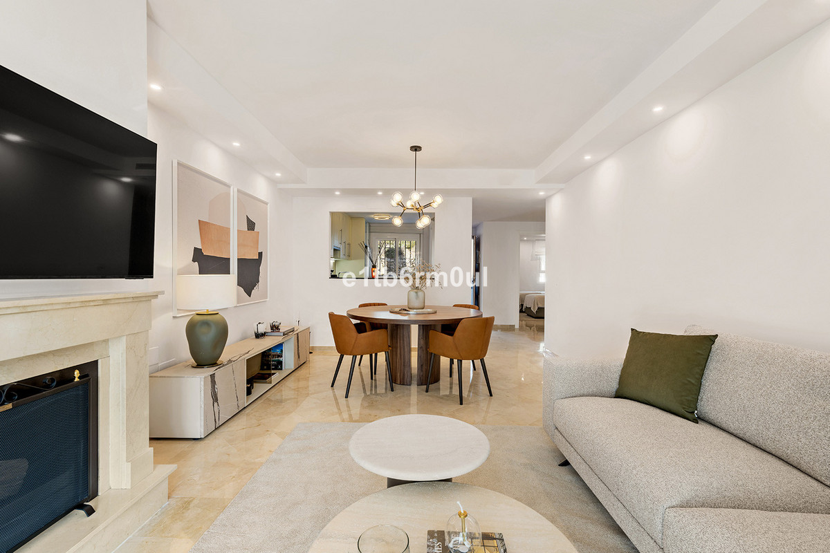 Recently and stylishly refurbished and furnished by Ambience Home Design this beautiful and bright contemporary apartment is located in a beautiful and well-kept community, in the heart of Nueva Andalucia. The accommodation has 2 bedrooms, 2 bathrooms (one of them en suite), a large living-dining room, semi-open kitchen, a large terrace fitted with Lummon-type glazing, allowing all year round use ideal for entertaining friends and family. The community is quiet and peaceful, has two swimming pools, one that is adapted for people with reduced mobility, and lush well-maintained gardens. Included in the price there is a generous parking space and 1 storage rooms. This is an ideal investment, holiday or forever home.
