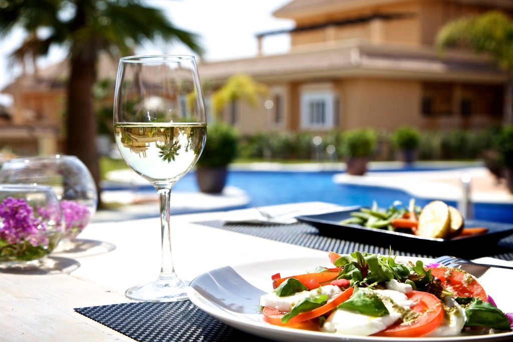 Three terraces offering panoramic views of the pool, gardens, golf courses, and the Mediterranean Sea