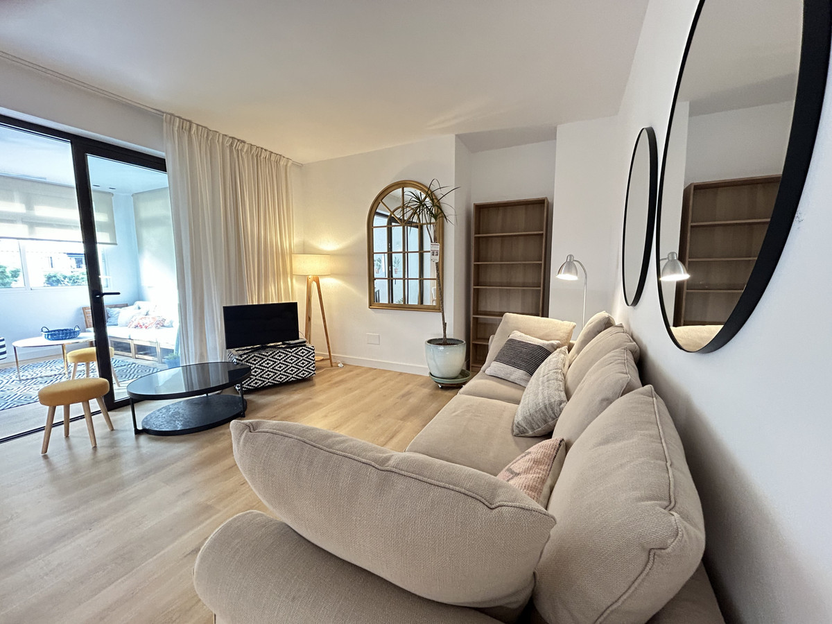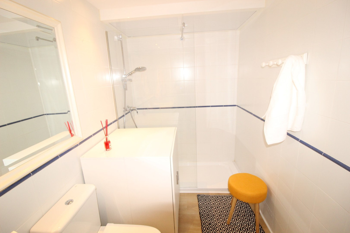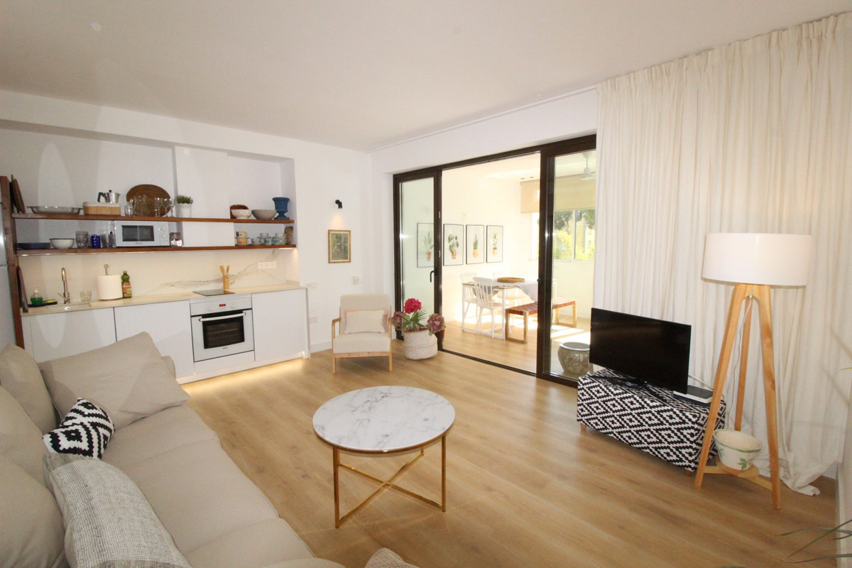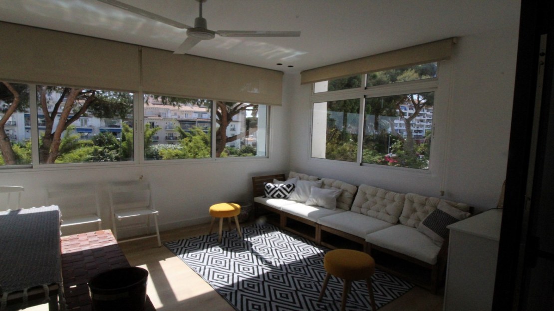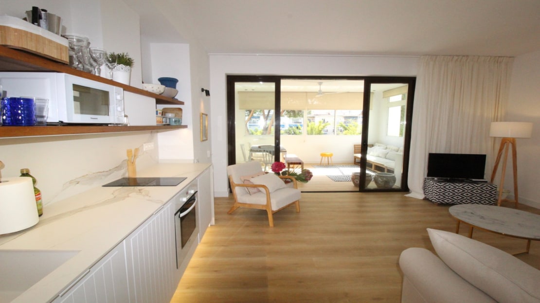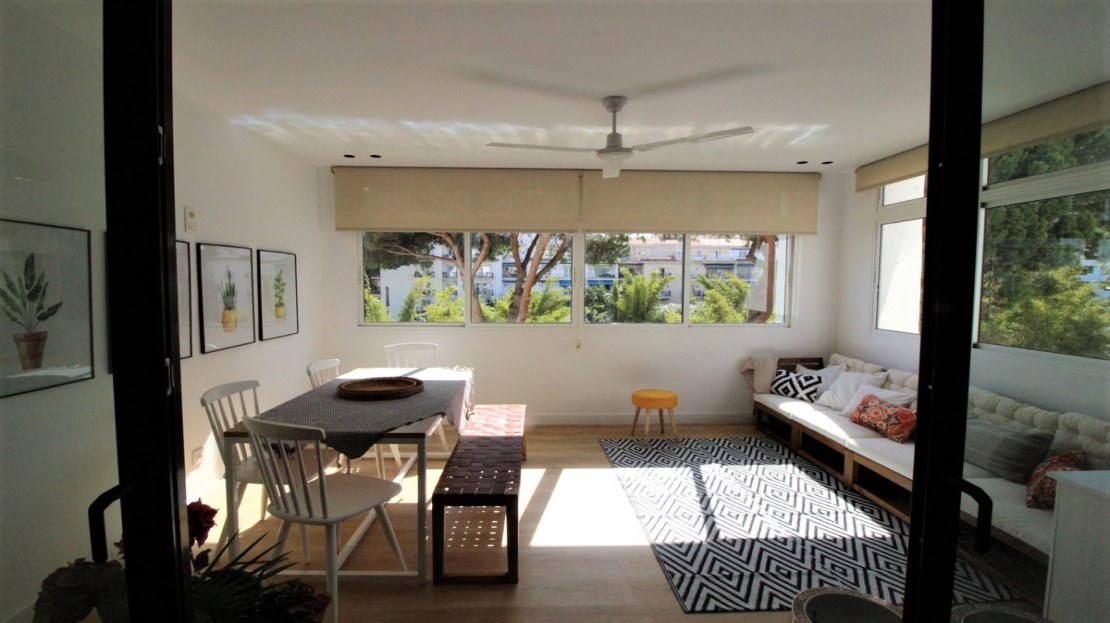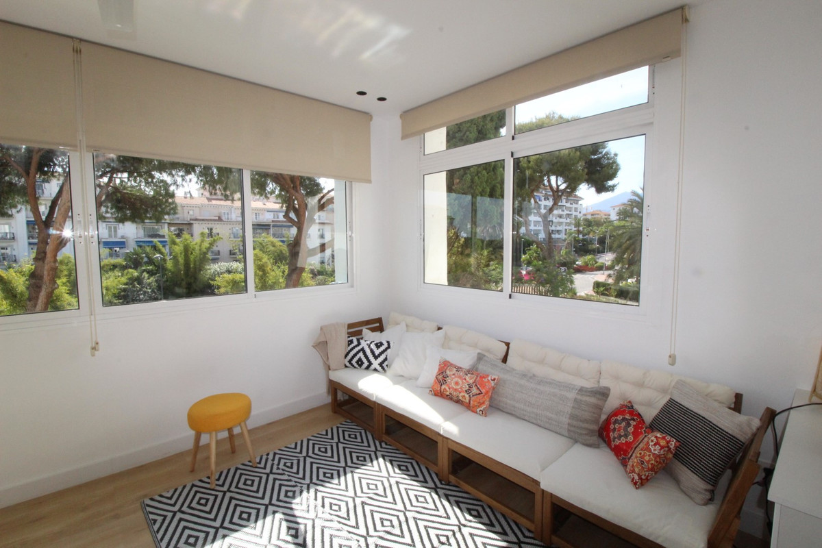 2 bedrooms apartment with a bathroom, sea views , west facing. refurbished recently. It is located in Playas del Duque The living room with open plan kitchen . The terrace is glazed and it has a nice dining area . The views are to the pedestrian promenade and to its side the wonderful sea, its so near that you nearly can touch it. Lots of light even the Bathroom with window. It is nice and confortable: Air conditioning, wooden flooring, nice kitchen , Garage and Securtity therefore its ready of course to enter living.