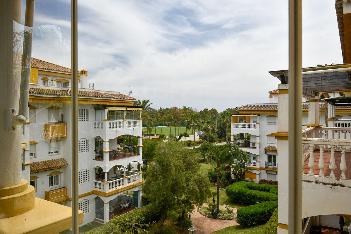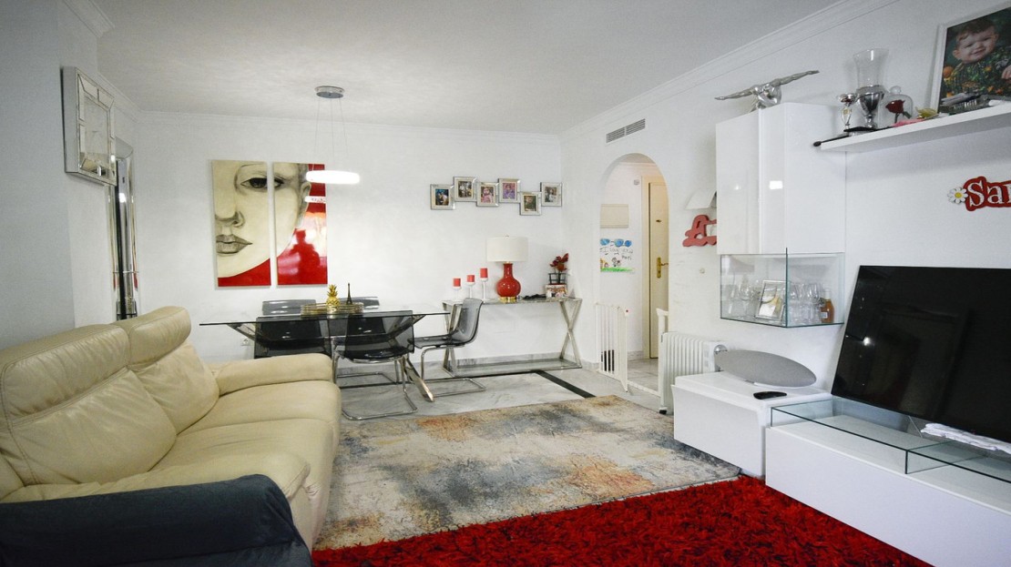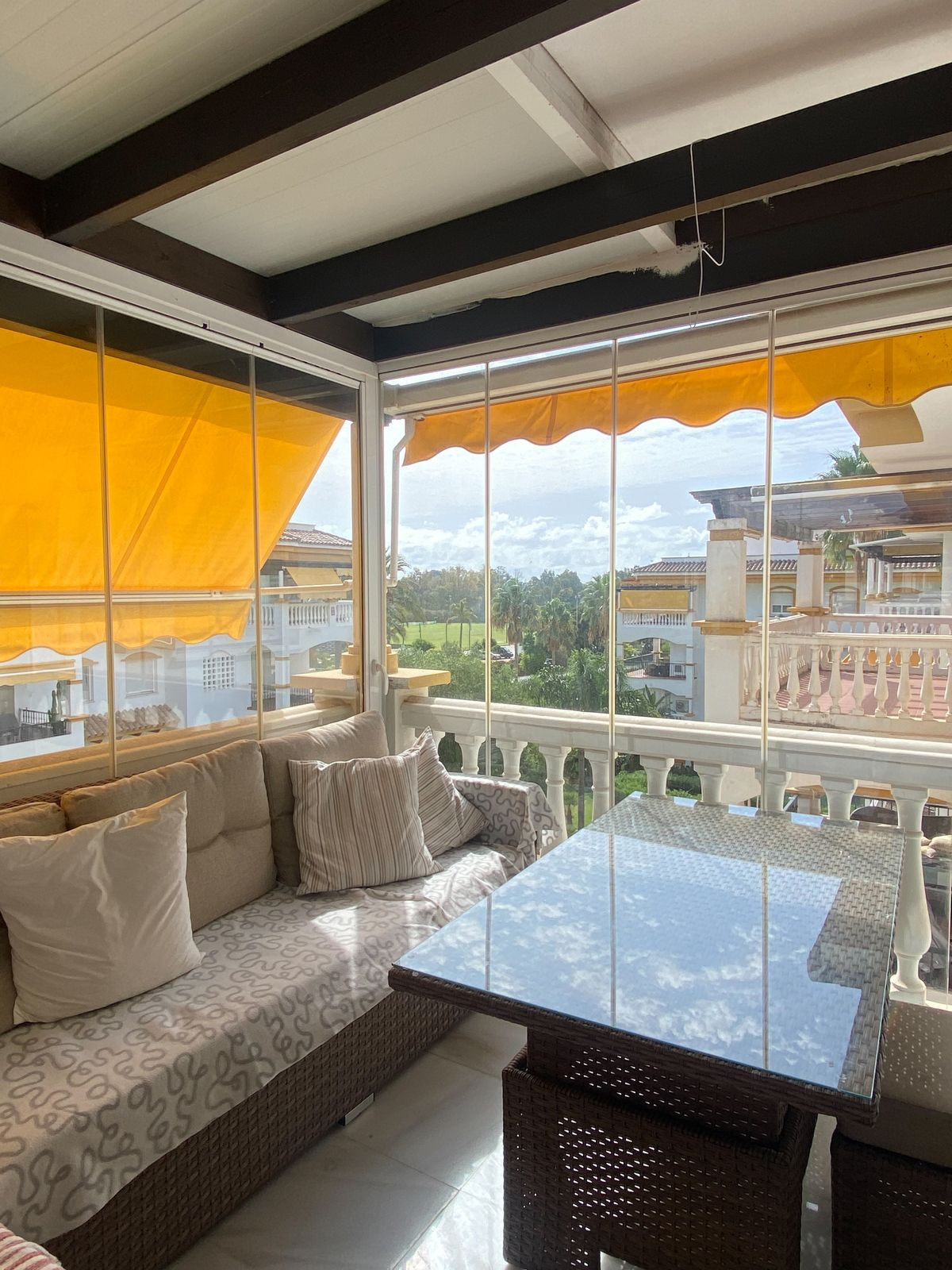 Escape to your own oasis in this middle floor apartment with lots of potential. Imagine relaxing on your spacious terrace, looking out onto the gardens, with the added luxury of glass curtains to be able enjoy the views all year round. The first 3 pictures we have used a virtual staging so that you can see how the property may look with new furniture and small renovations.