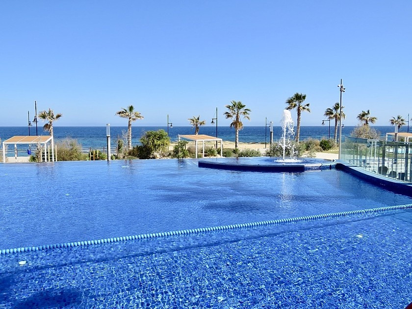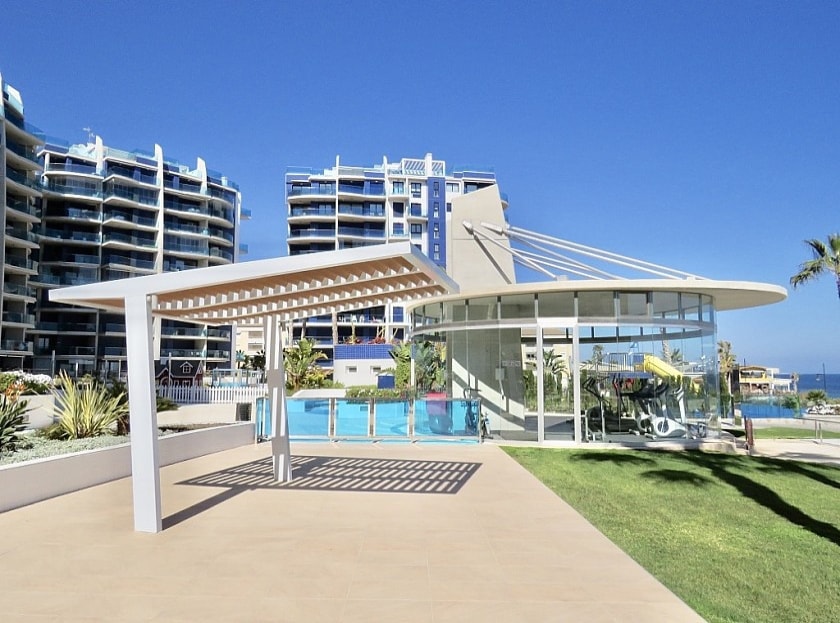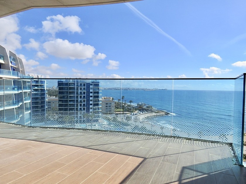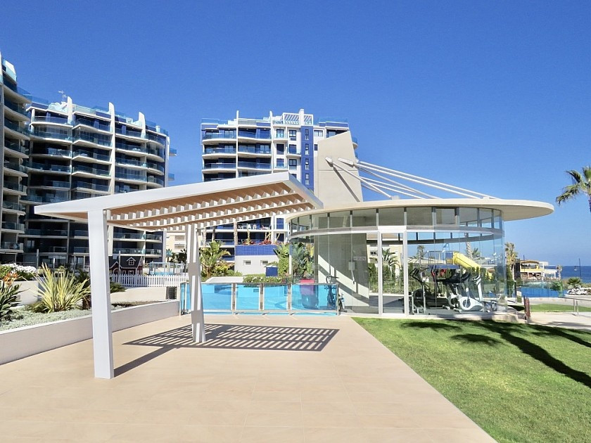 2 bedroom apartment on the seafront in Punta Prima . Luxury apartment with 2 bedrooms and 2 bathrooms and a large east-facing front terrace with spectacular views of the sea, Torrevieja and the communal areas with several swimming pools, gym, jacuzzi, sauna, children's and sports areas.