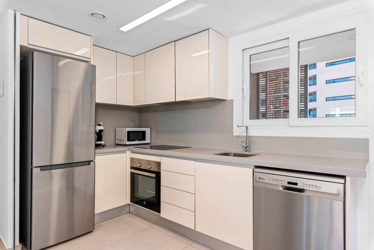 The kitchen is efficiently designed with modern appliances, ample counter space, and convenient access to the dining area, making meal prep and hosting effortless. Additionally, a second south-facing balcony is accessible from the kitchen, ensuring a bright and airy atmosphere throughout the apartment.