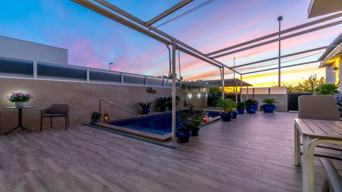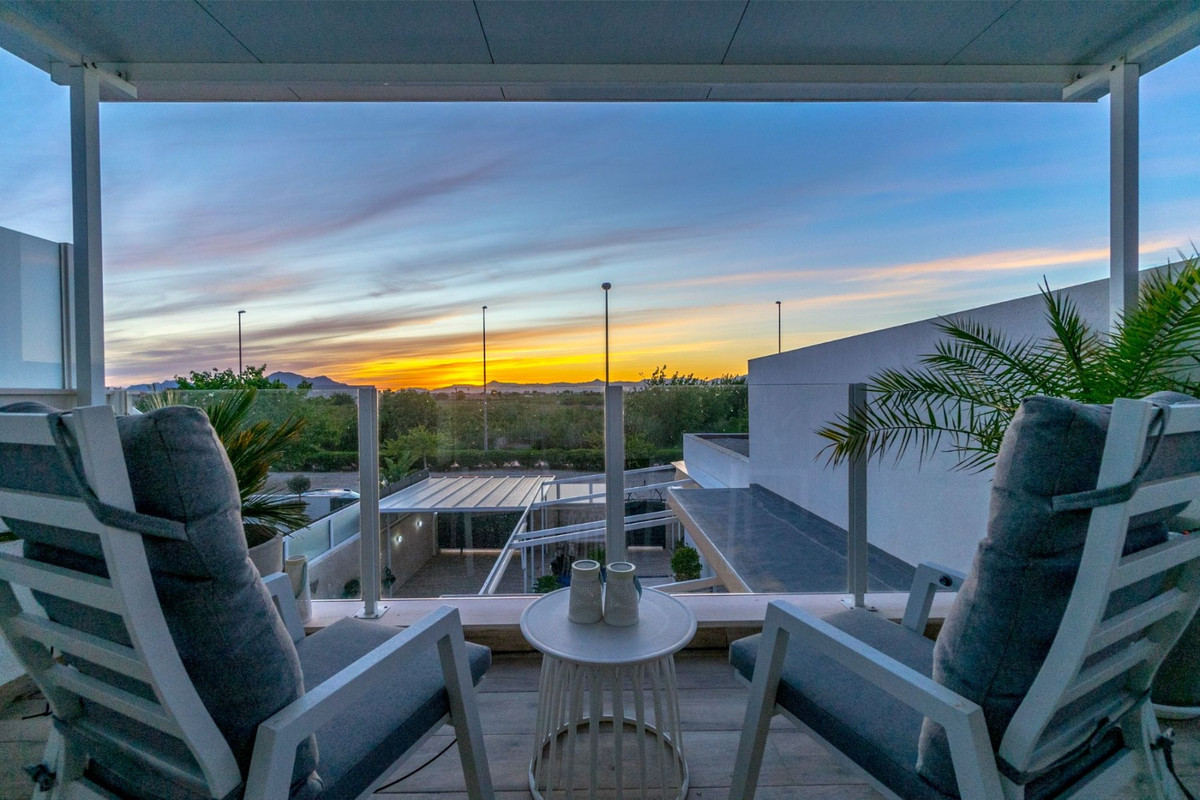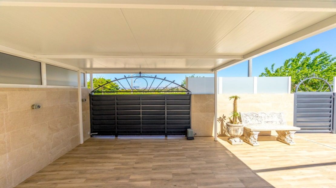 One of the several highlights of this property is the outdoor space which also includes a lovely roof terrace with a perfect view of orange groves and untouched landscape with the mountains in the background. All designed to make the most of the Mediterranean climate. The spacious terrace and patio are perfectly designed for alfresco dining or simply enjoying a glass of wine while taking in the stunning views of the surrounding countryside. The private saltwater swimming pool is surrounded by a beautifully landscaped garden and offers the perfect place to cool off on hot summer days as well as shade from the sun with the large pergola that covers the entire patio area in front of the pool.