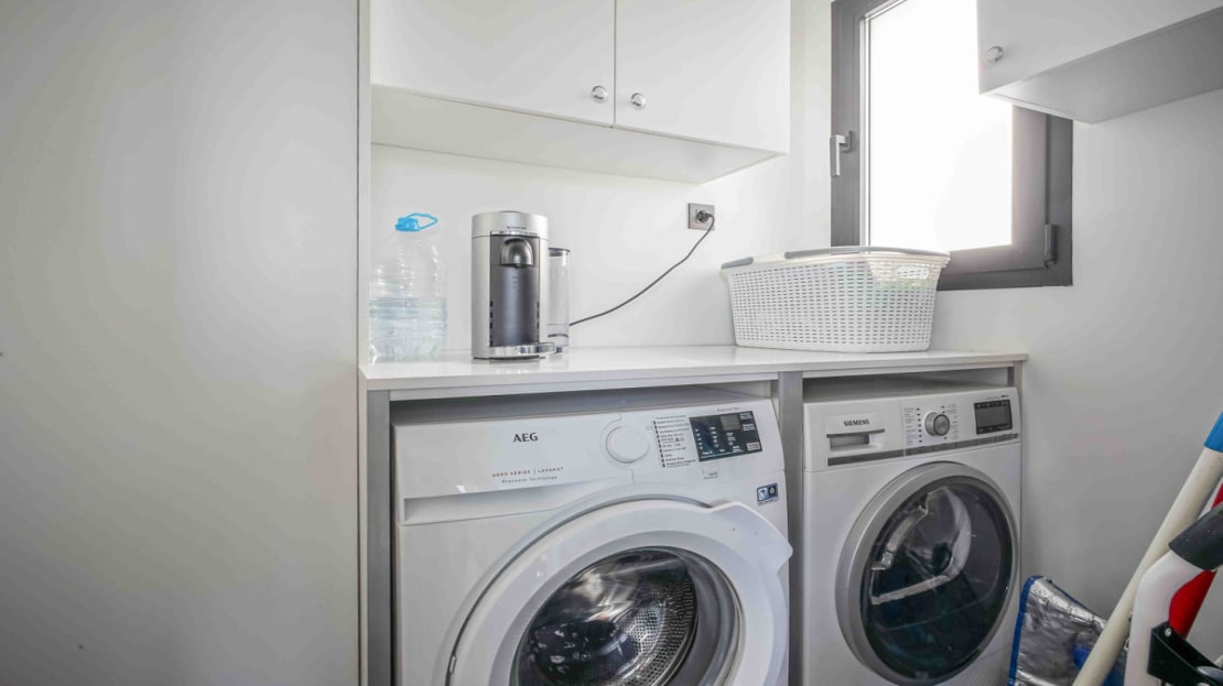 This beautiful villa is located in a nice, modern residential area 10 minutes from the center of Benidorm. At 5 minutes is a shopping center with several large supermarkets, all other amenities such as hospital, sports hall, golf, schools, beach, etc. can be reached in 10 minutes. It is located on a flat plot and surrounded by a beautiful landscaped garden. The villa consists of a spacious living-dining room with an open kitchen, a utility room, a guest toilet and 2 large double bedrooms each with an en suite bathroom. From the kitchen and living room you can access the poolside terrace through the large sliding windows. The terrace faces south-east so you can enjoy the sun here all day, there is also an awning to provide shade. There is also a large roof terrace with views of the skyline of Benidorm and the azure Mediterranean sea. The villa was built in 2019, but in the last few years a completely new high quality kitchen has been installed, also the 2 bathrooms have been renewed and have both received a walk-in shower. In addition, this property has extras, for example there are decorative elements placed against the wall outside that provide mood lighting at night, there is also a gazebo, an outdoor shower, a barbecue and a pergola. Both curtains and furniture are included in the price.