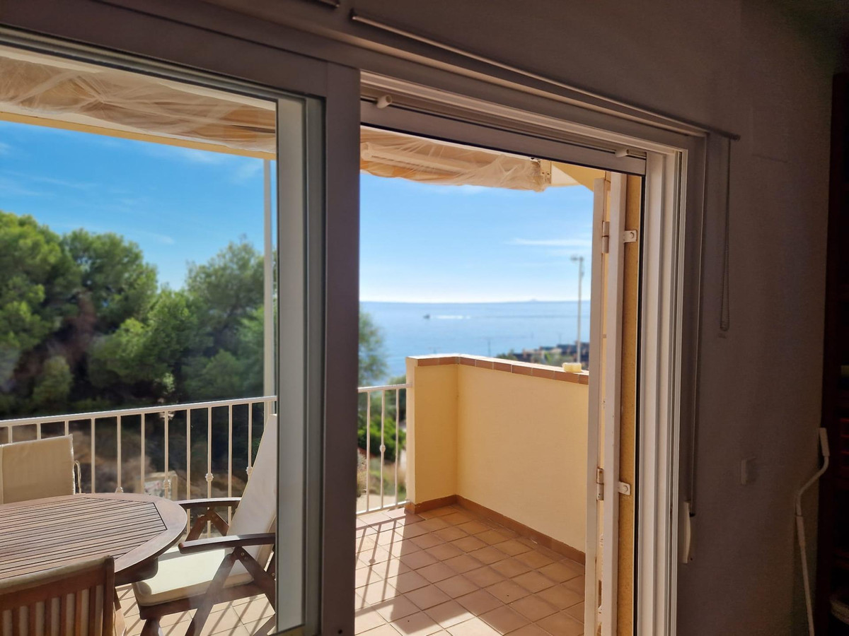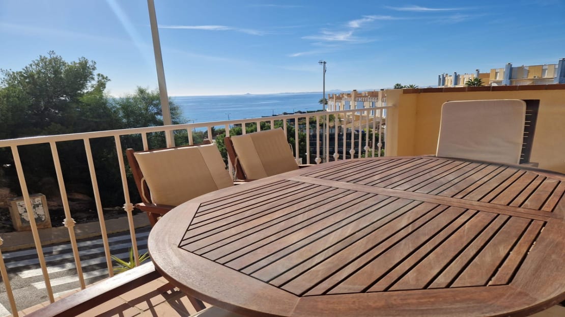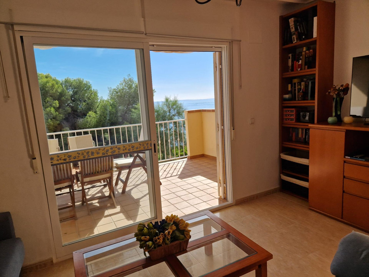 Front line apartment with great sea views in Aguamarina on the 1st floor of a 80 m2 house, with 2 bedrooms and 1 bathroom, living room with access to terrace, separate kitchen with laundry room. The apartment is sold with furniture. Residential with communal pool, the price includes the parking space in the underground garage and the storage room. A wonderful holiday home on the Mediterranean coast, for the family or as an investment!