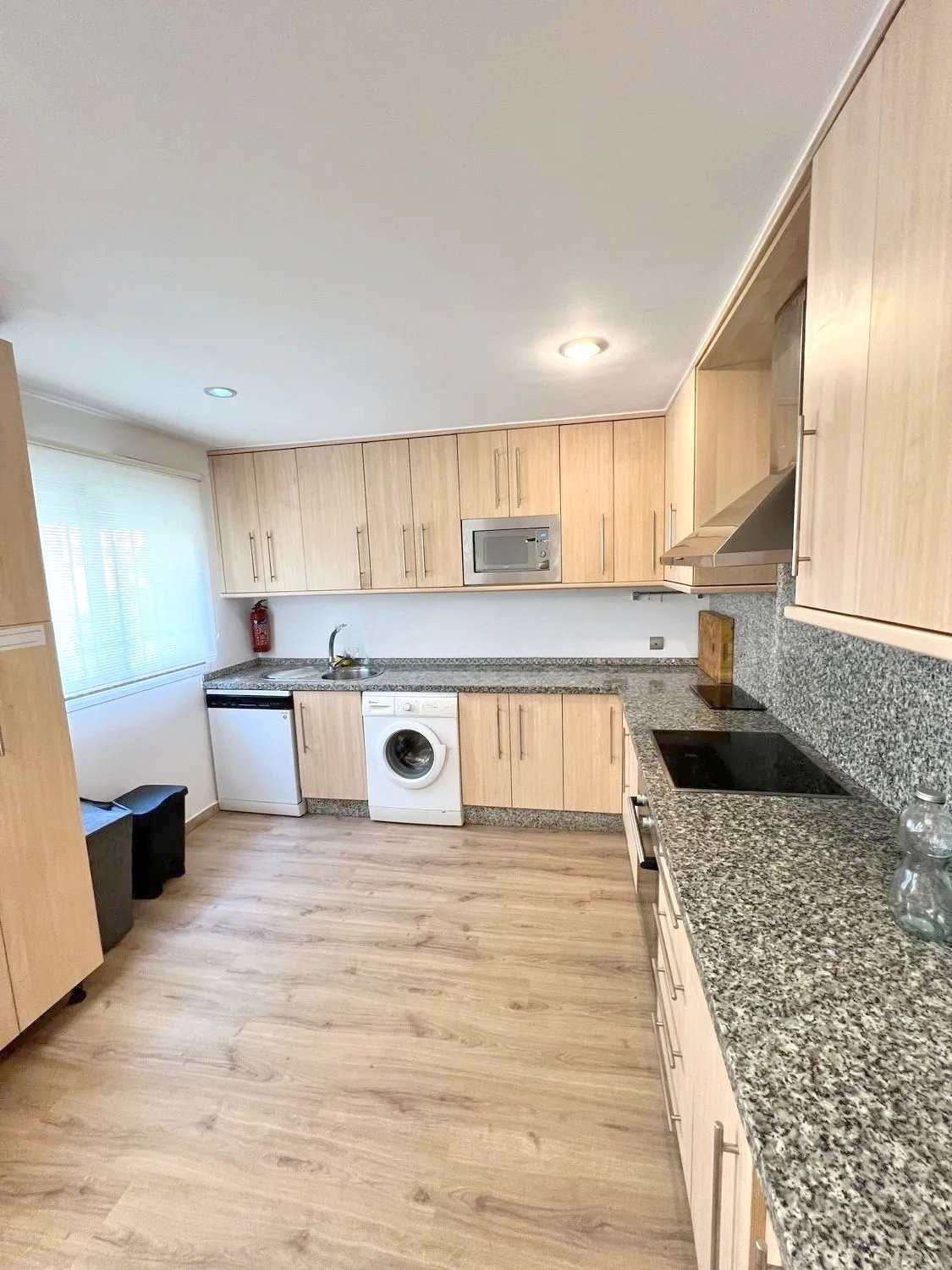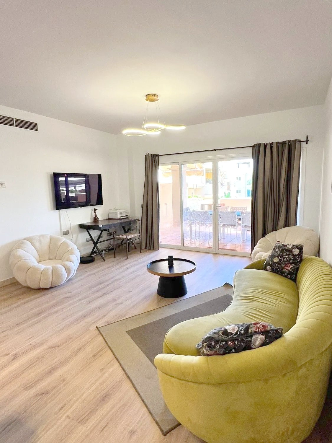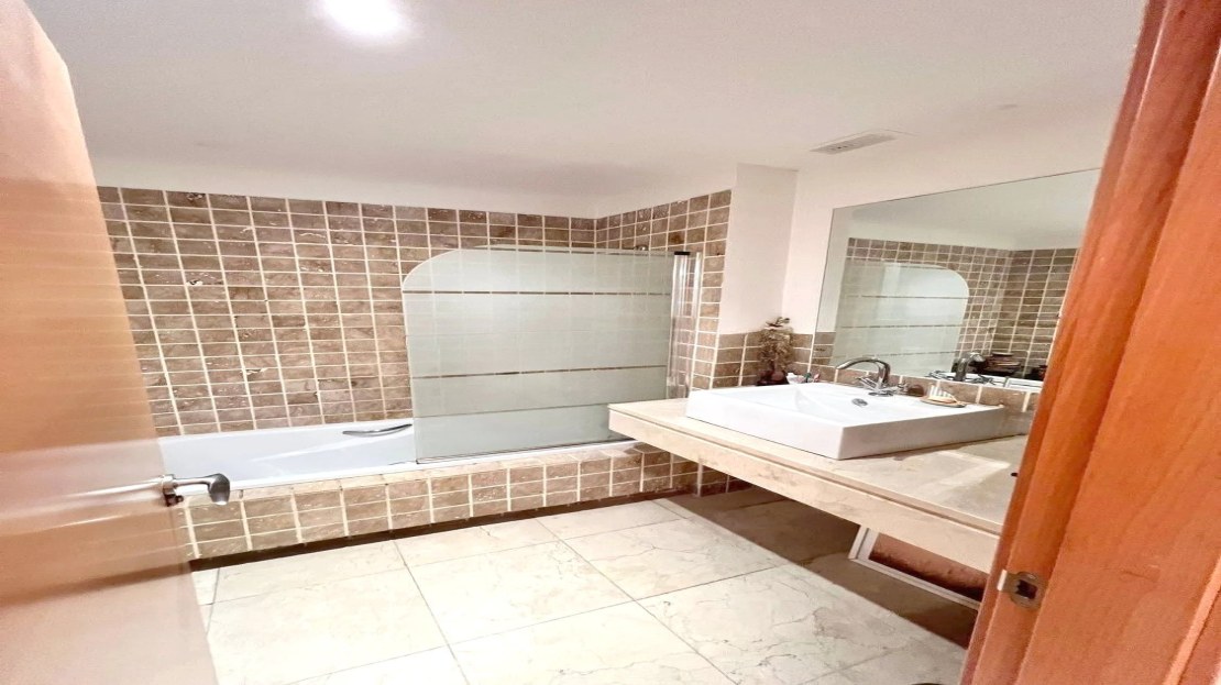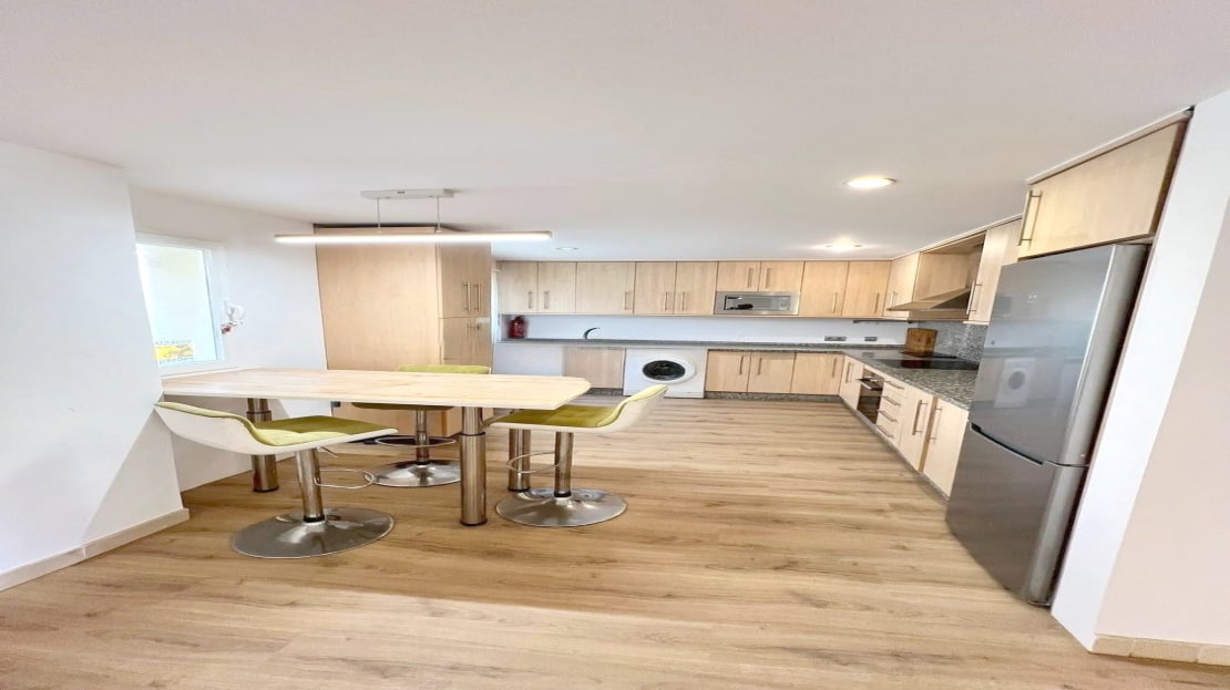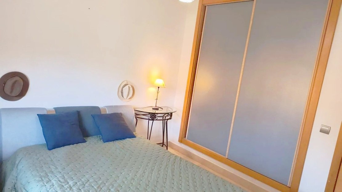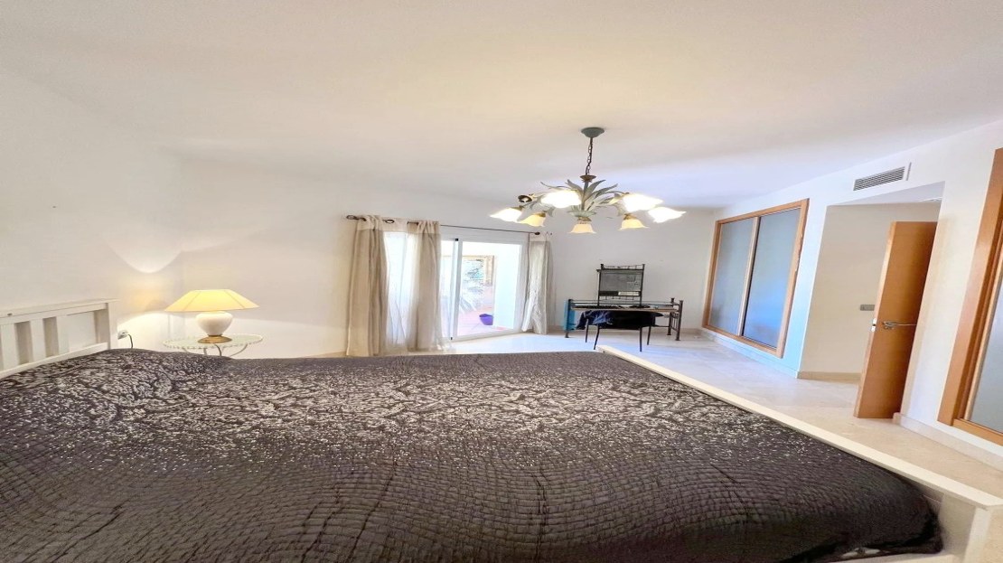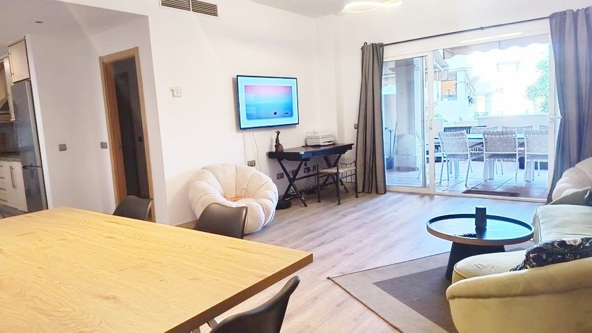 Upon entering the apartment, you find a spacious living room that seamlessly integrates with the open-concept kitchen, fully equipped with modern appliances. From the living room, there is access to a private covered terrace with direct access to the garden and the communal pool, providing an atmosphere full of natural light and tranquility.